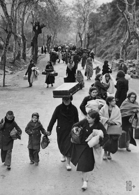 Роберт Каппа является автором огромной фотосерии, посвящённой беженцам из Испании. После начала гражданской войны в 1936 году и захвата Франко 26 января 1939 года Барселоны — более 500 тысяч беженцев-республиканцев отправляются во Францию, в надежде спаситесь от нового режима, от приближающегося фашизма. Их побег к границе стал опасными путешествием, не закончившимся благополучно. Франция была не готова к такому потоку беженцев, ей не хватало продовольствия, мест, а условия лагерей, по которым были распределены интернированные, оказались суровым испытанием. На снимках Каппы мы наблюдаем за передвижением многочисленных колон беженцев. Большинство из них преодолевает сложный путь пешком. Роберт Каппа становится участником непростого перемещения. Его документальные кадры изнурённых дорогой и событиями людей оказываются важной частью понимания тяжелейшего положения беженцев.