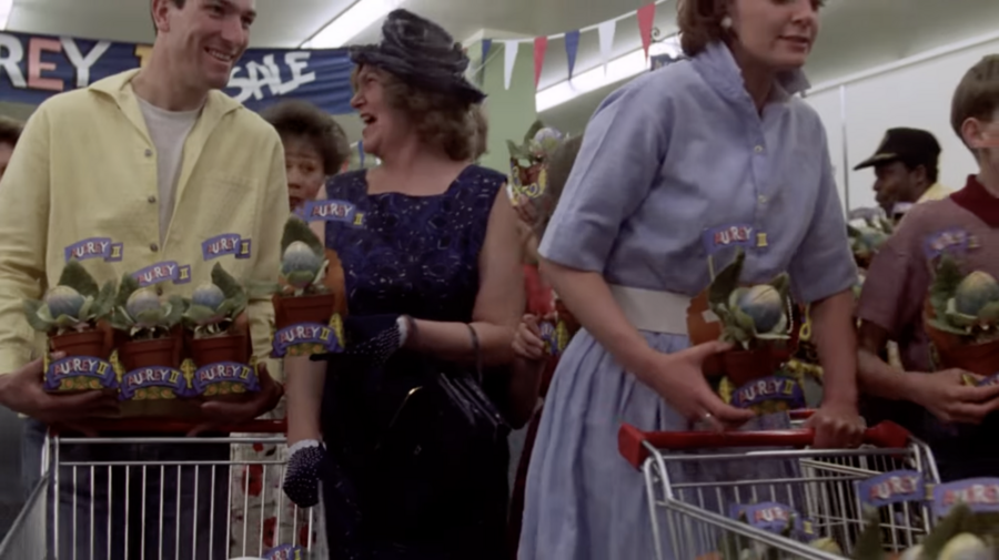 Кадр из фильма «Маленький магазинчик ужасов», жители скупают растение Одри II