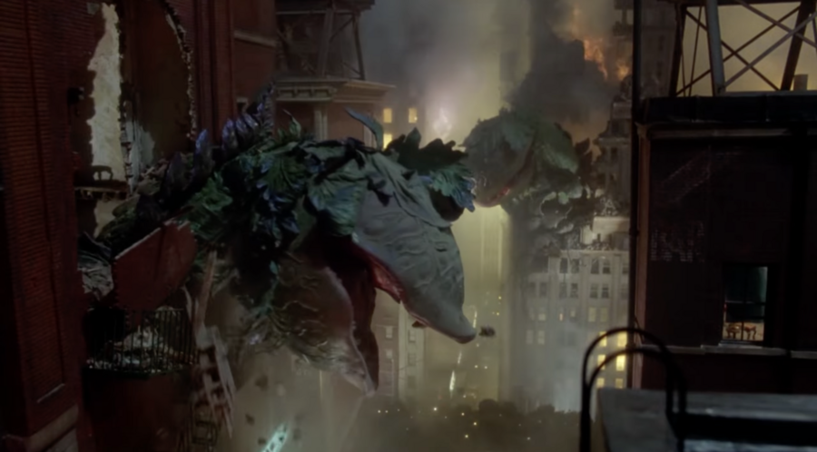 Кадр из фильма «Маленький магазинчик ужасов», растения захватывают город