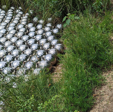 Инсталляции Кусамы показывают металл как элемент среды — зеркальные сферы образуют ритм, создают оптическое поле и взаимодействуют с окружением.