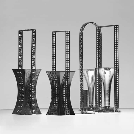 Обращение к работам Йозефа Хоффмана позволяет увидеть, как металлические конструкции могут строиться на строгой модульности. Корзины и вазы, основанные на сетчатых структурах, раскрывают металл как материал с повышенной способностью к упорядочиванию.