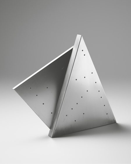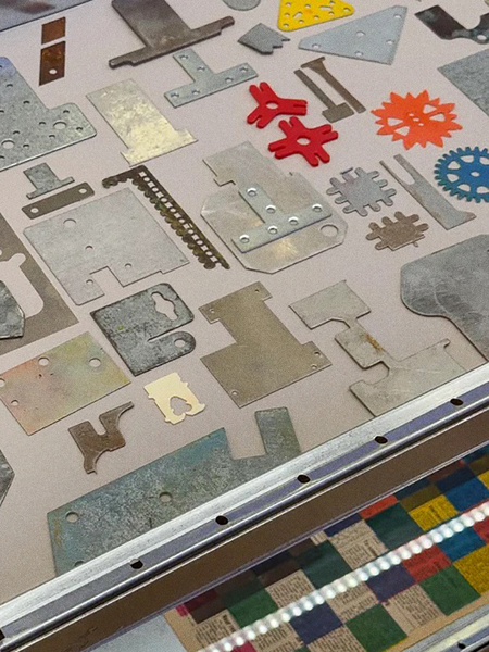 Работы Карела Мартенса вдохновили меня тем, как он позволяет материалу становиться частью визуального языка. Вместо привычной роли «носителя» металл у него превращается в активный элемент композиции: отпечатки найденных деталей становятся основой ритма и структуры. Это не про декор — это про логику самой материи и про систему.