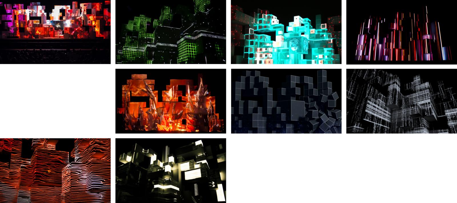 Alva Noto, кадры серии «UNIEQAV», 2018; «HYbr: ID», 2021-24 // Nonotak Studio, фотодокументация проекта «DAYDREAM V.2», 2016 // М. Фелл, фотодокументация проекта «Recursive frame analysis», 2015.