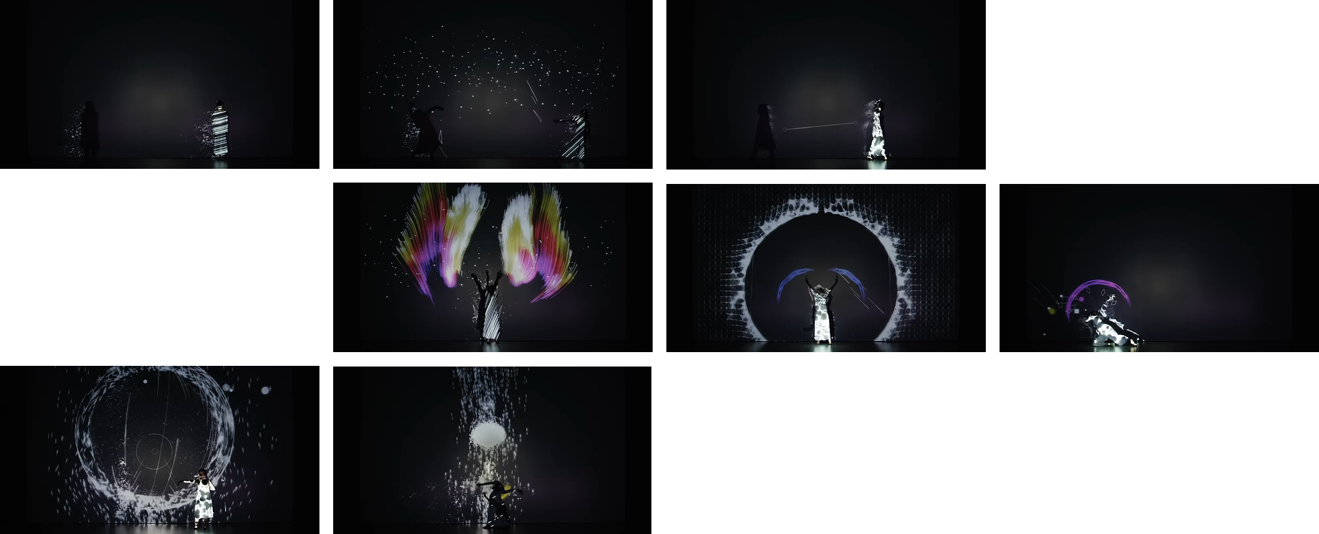 Д. Манабэ, «Continuum Resonance», 2024; «Sensing Streams», 2014 // Ж. Лемерсье, кадры «Nimbes», 2014 // TeamLab, «Universe of Water Particles…», 2013; «Crows are Chased…», 2017.