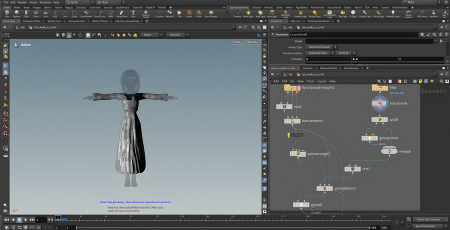 Так как симуляция затрагивает исключительно юбку, а верхняя часть платья является частью общего скина, необходимо аккуратно соединить обе части одежды. Для этого выделяем ограниченную швами группу точек и соединяем их нодой Fuse.