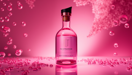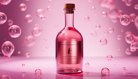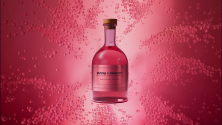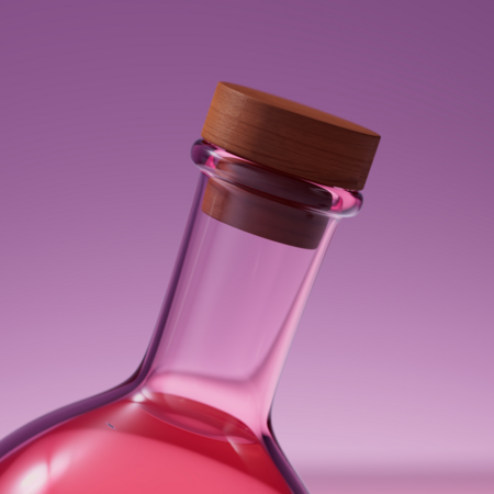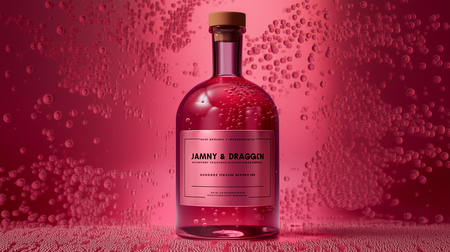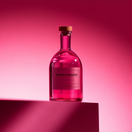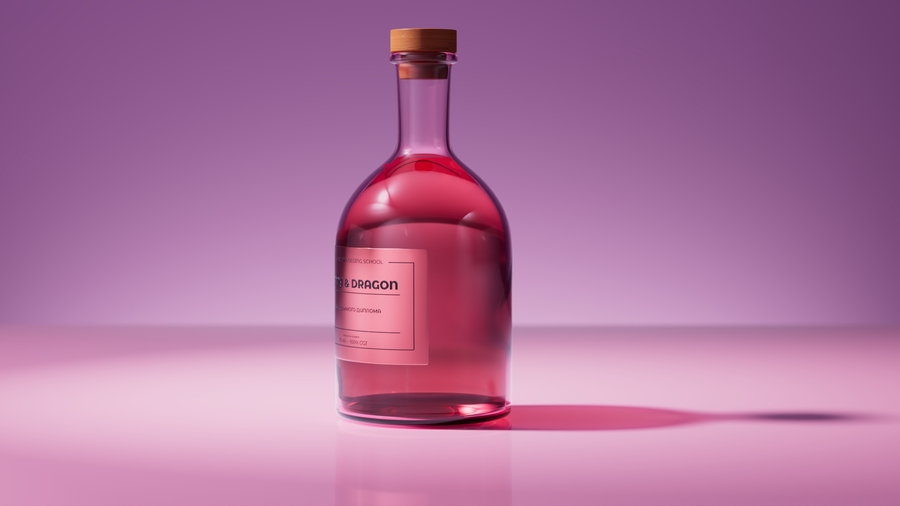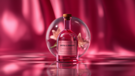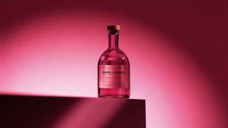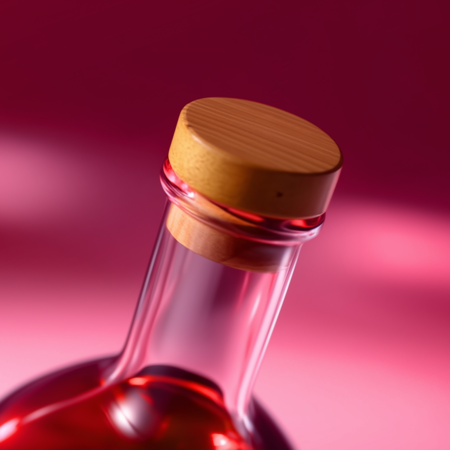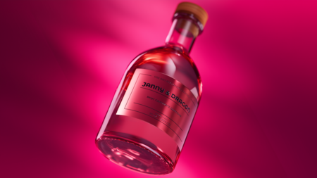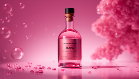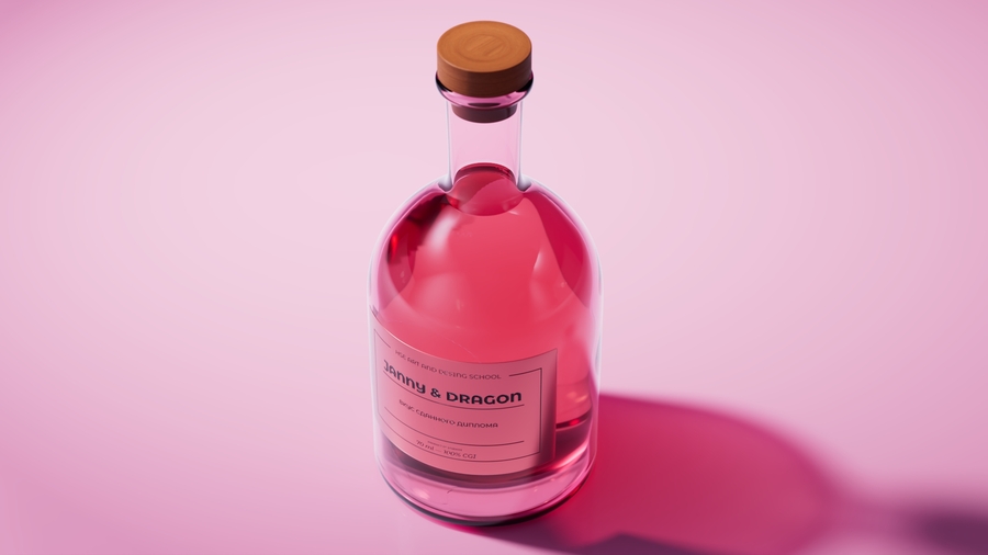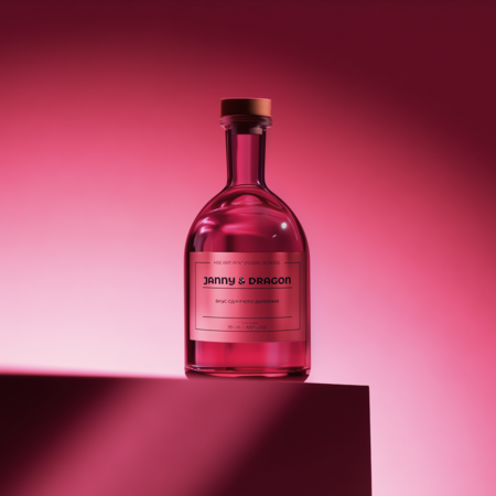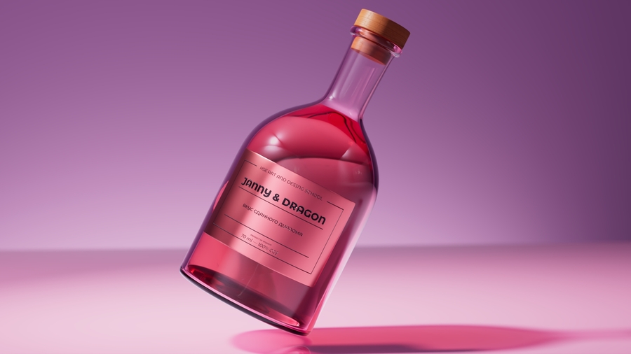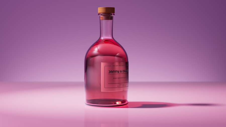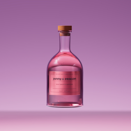 Janny, розовая стеклянная бутылка с деревянной пробкой в центре кадра.