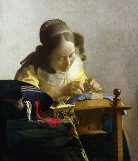 В живописи Яна Вермеера кружево представляется радикально иначе. Оно выходит за пределы придворной парадности и переносится в сферу частной, интимной повседневности. Его героини существуют не только в рамках багета на картине, а в пространстве за ее пределами — они шьют, вышивают, плетут кружево или взаимодействуют с ним в бытовом контексте. Вермеер рассматривает кружево не как предмет роскоши, а как часть тонкой ручной работы и символ женской сосредоточенности. В его картинах кружево часто оказывается не просто частью костюма, а визуальным мотивом, через который раскрывается внутренняя жизнь персонажа.