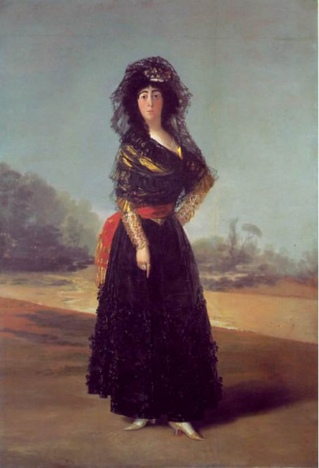 В работах Франсиско Гойи кружево перестаёт быть просто элементом костюма — оно превращается в культурный код, через который художник раскрывает идею испанской женственности. Особое значение приобретает мантилья — традиционная кружевная накидка, чья визуальная роль в испанском обществе XVIII–XIX веков охватывала целый спектр смыслов: от набожной скромности до сознательной чувственности. В «Герцогине Альба в чёрном» черная мантилья не смягчает образ, а напротив — усиливает его драматизм, подчёркивая волевую, гордую и внутренне независимую женственность. Гойя показывает, что кружево в Испании — это не воздушная беззаботность французского рококо, а материал, впитавший национальный характер: контрастность, страсть и самодостаточность.