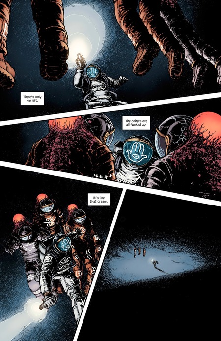 В сюжете есть темные сцены, где единственным источником света является фонарик, а действие происходит на астероиде, несоразмеримым с человеком. Но из-за столь редкого появления этих сцен в такой визуально безумной истории они просто выглядят блекло и не имеют того же веса. Здесь этот контраст условного цвета с тьмой не работает, потому что соотношение абсолютно перевешено. Хоррор составляющие, как мистика и саспенс, на этом фоне теряются, и комикс становится обычной сай-фай историей с явно показанными потусторонними ужасами.
