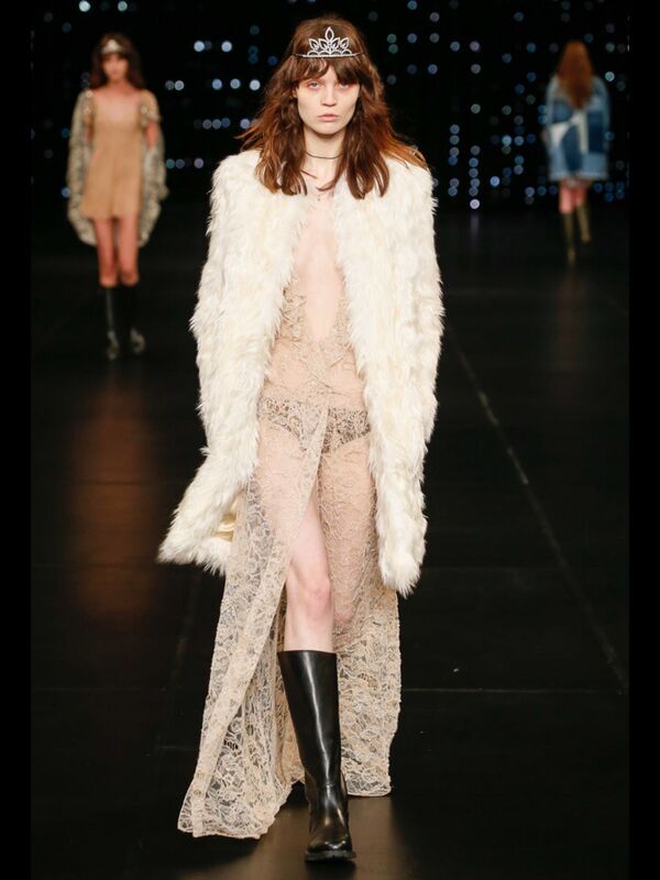 Saint Laurent интерпретировал кружево как элемент роковой, минималистичной сексуальности, сочетая его с строгими линиями и кожей.