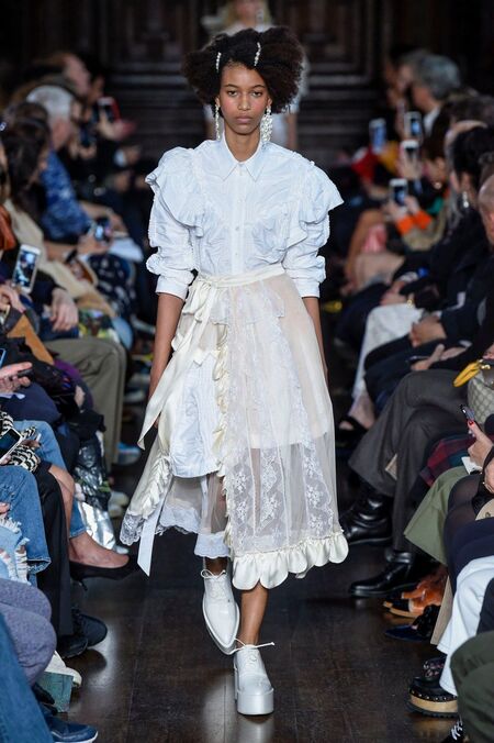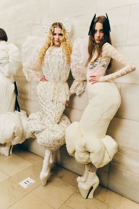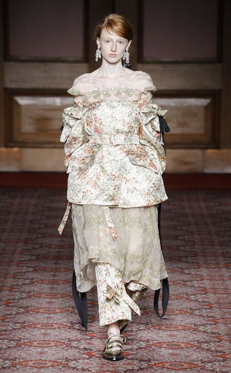 Simone Rocha, напротив, выводила кружево в область фантазии: объемные рукава, рюши, многослойные конструкции превращали ажур в почти скульптурный, сюрреалистический элемент.