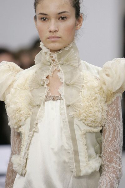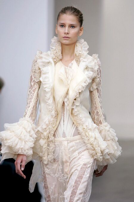 Alexander McQueen давал кружеву более концептуальный контекст: у него оно становилось элементом драмы, готики и фантазийных историй, нередко соединяясь с кожей, металлом и плотными тканями. Valentino делал ставку на утончённую элегантность: кружево использовалось для изысканных вечерних образов, воздушных платьев и романтических силуэтов, сохраняя аристократическую утонченность. Balenciaga интерпретировала кружево более графично и архитектурно, Chloe — как часть мягкой, богемной женственности, а Ralph Lauren адаптировал его к американской романтике и винтажной эстетике.