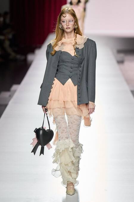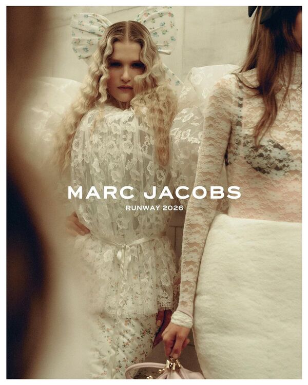 Marc Jacobs 2025 выводит кружево и гипюр в игру с текстурой, превращая их в декоративный, почти арт-объект. Тут наблюдается утрированная кукольная женственность, которая отображает кокетство и необычное проявление форм.