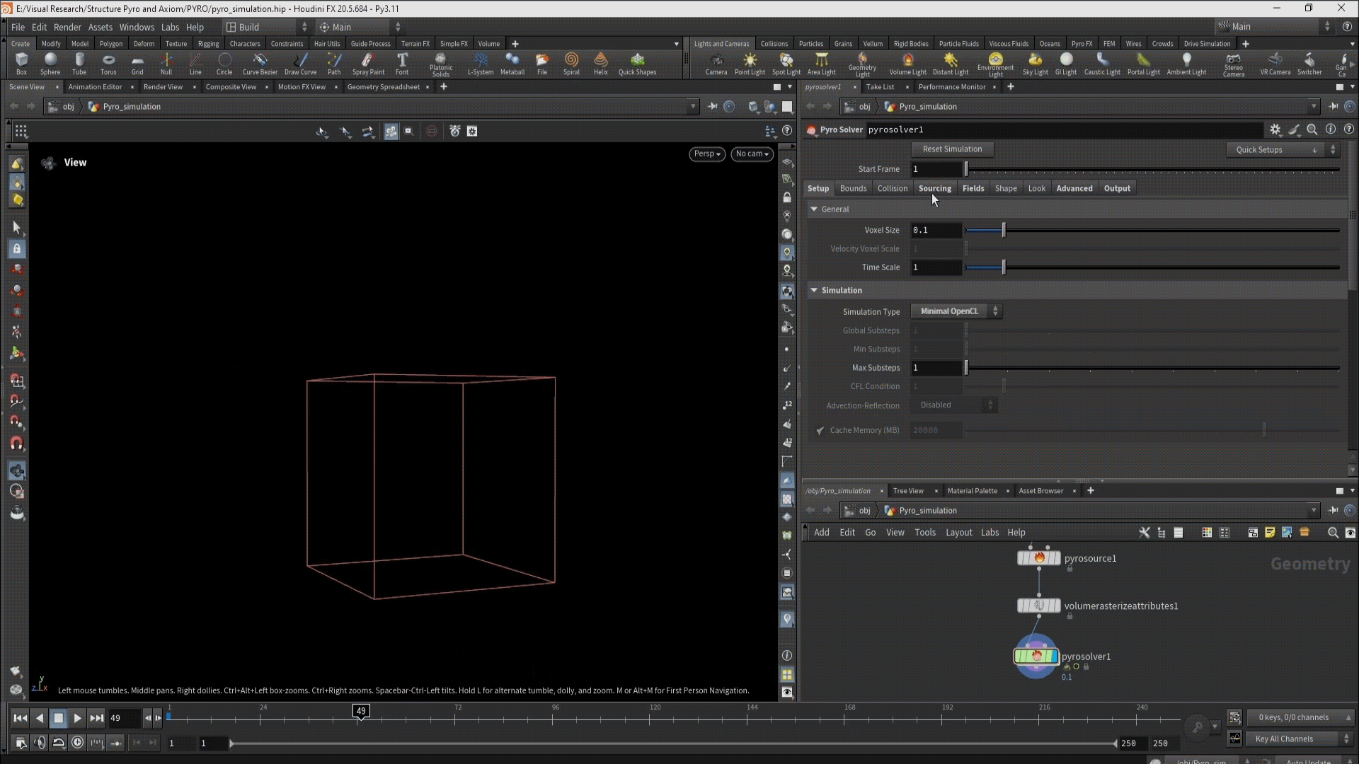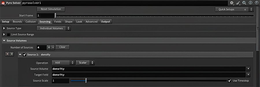 В разделе «Sourcing» предоставляется возможность самостоятельной настройки количества кадров и повторений, используемых в симуляции. Кроме того, пользователь получает ручное управление активной областью. Важно отметить, что pyro в данном режиме не выполняет кэширование шагов, что отличает его от Dense и Sparse методов, где нижняя полоса индикации окрашивается в синий цвет.