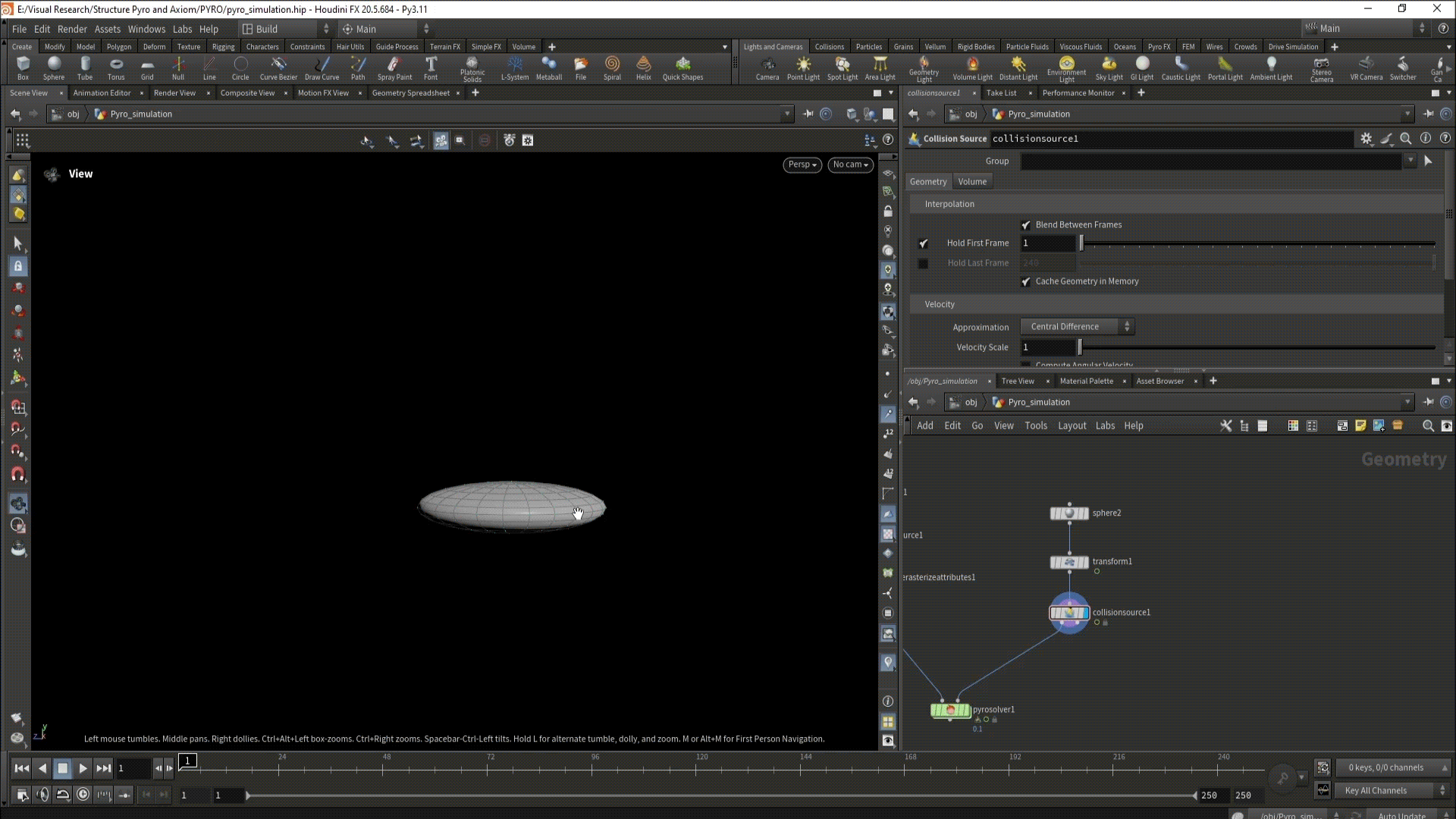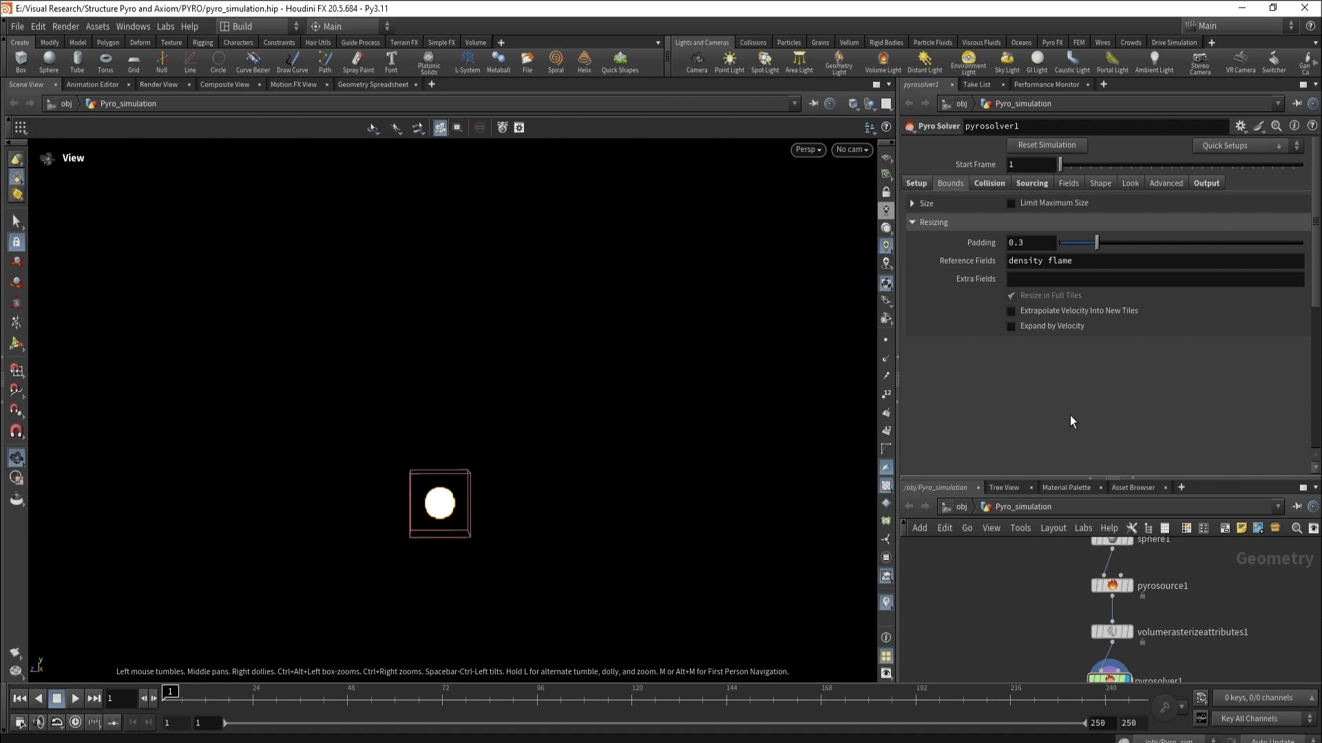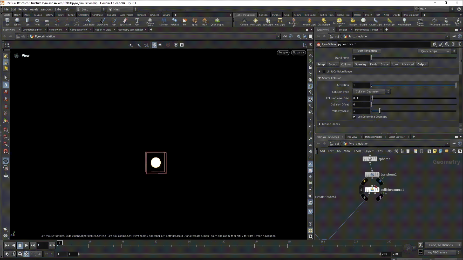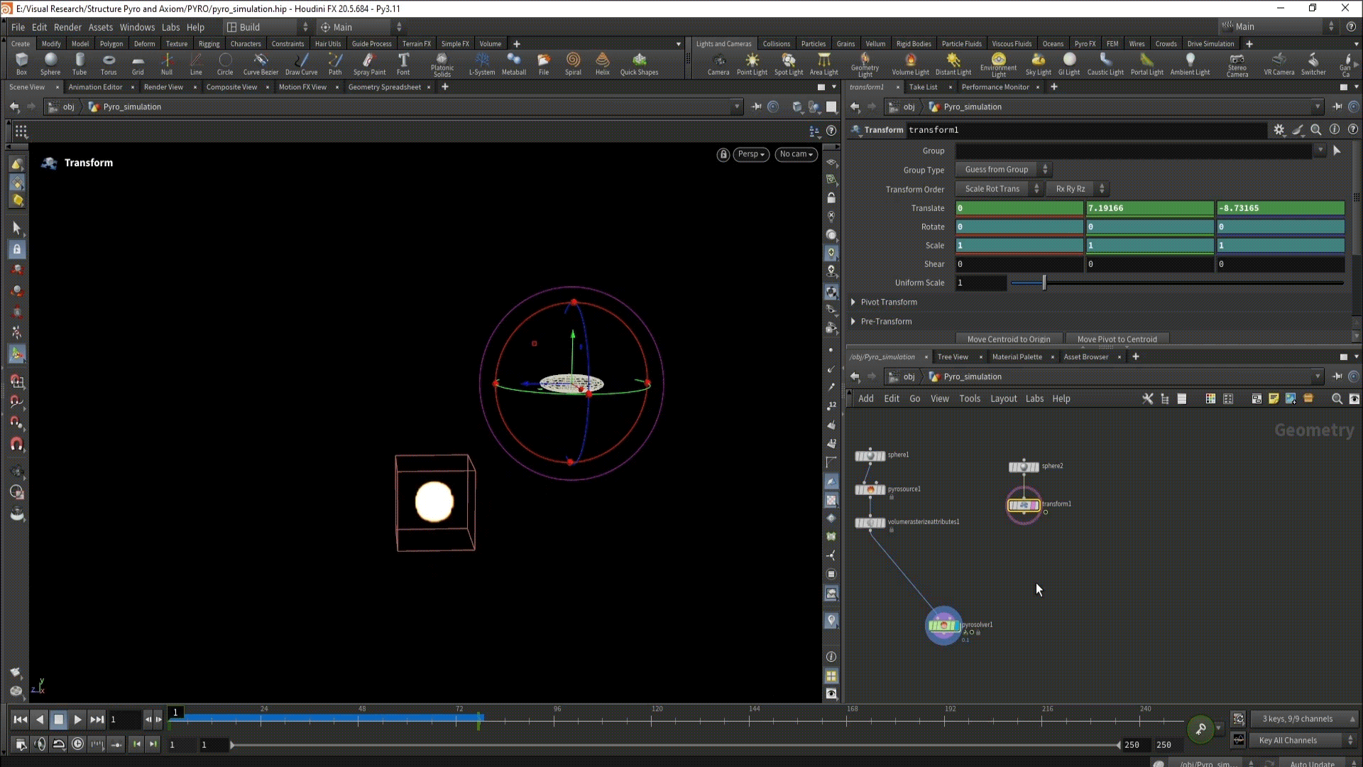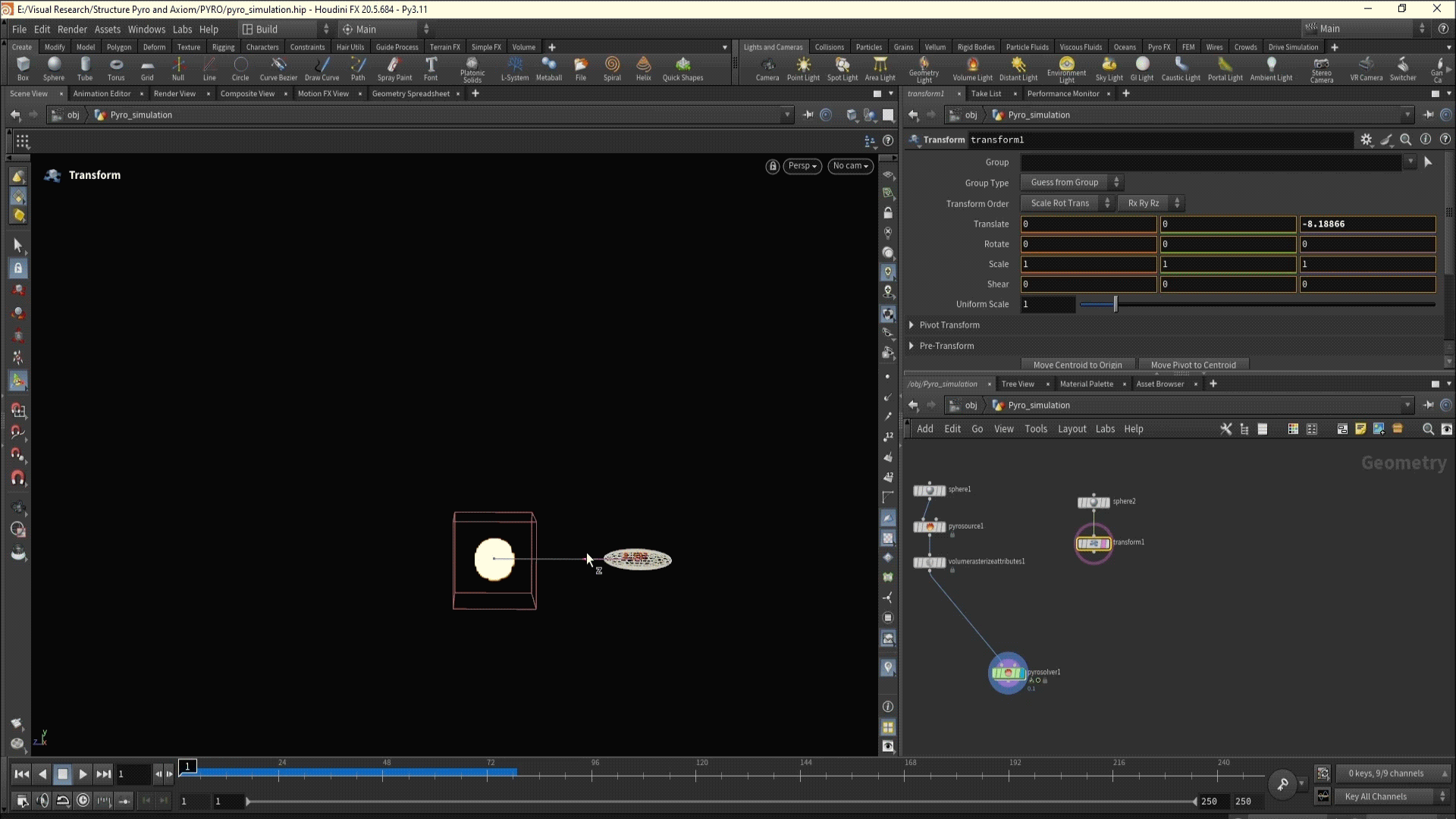 Стандартная сфера применяется в роли геометрии для обнаружения столкновений, а также создаётся непродолжительная анимация, предназначенная для частичного перекрытия пламени. Для одновременного визуального контроля как сферы, так и процесса моделирования, курсор направляется на pyro solver, затем активируется красная стрелка в узле «transform». Формирование ключевых кадров может быть инициировано нажатием на иконку ключа в нижней правой части интерфейса, либо через раздел «translate» в узле, отвечающем за трансформацию геометрии. В указанном разделе, при помощи правой кнопки мыши, выбирается опция «keyframes» и затем «set keyframe».