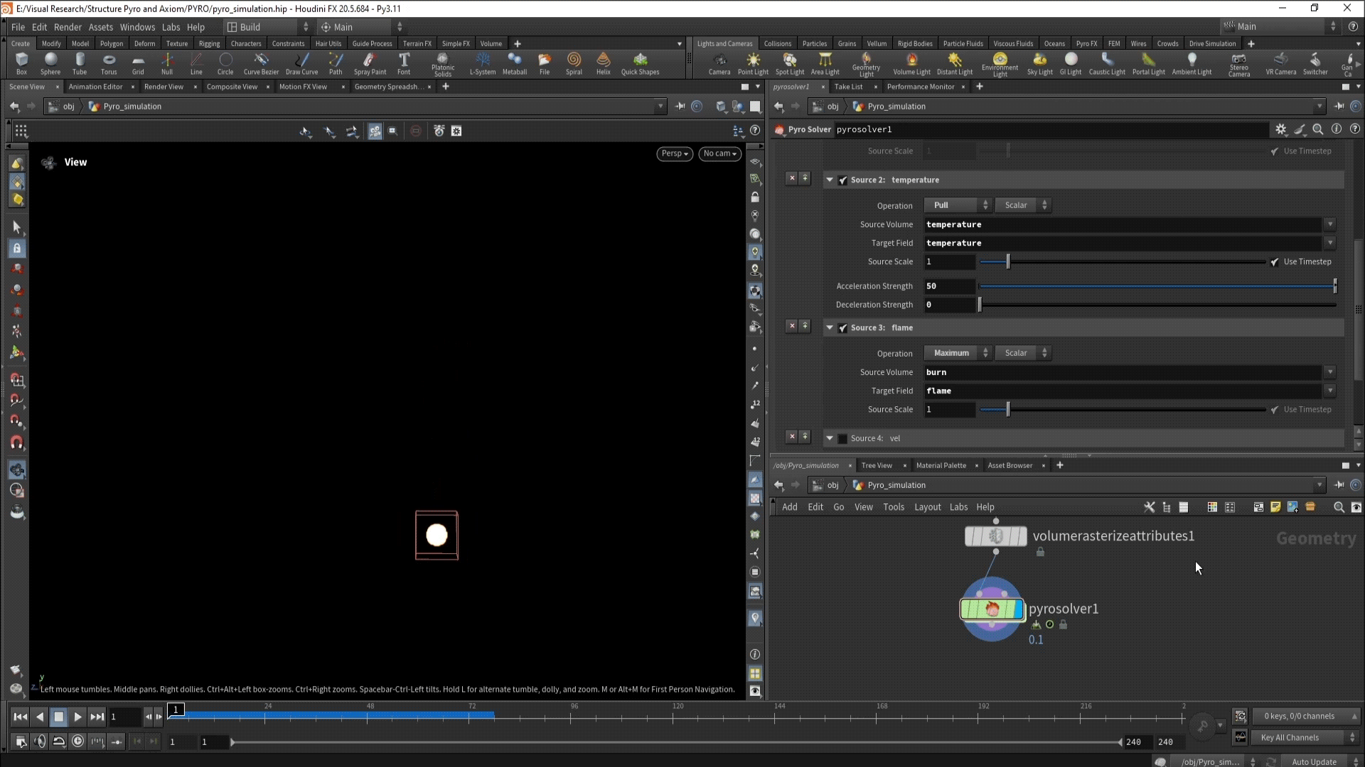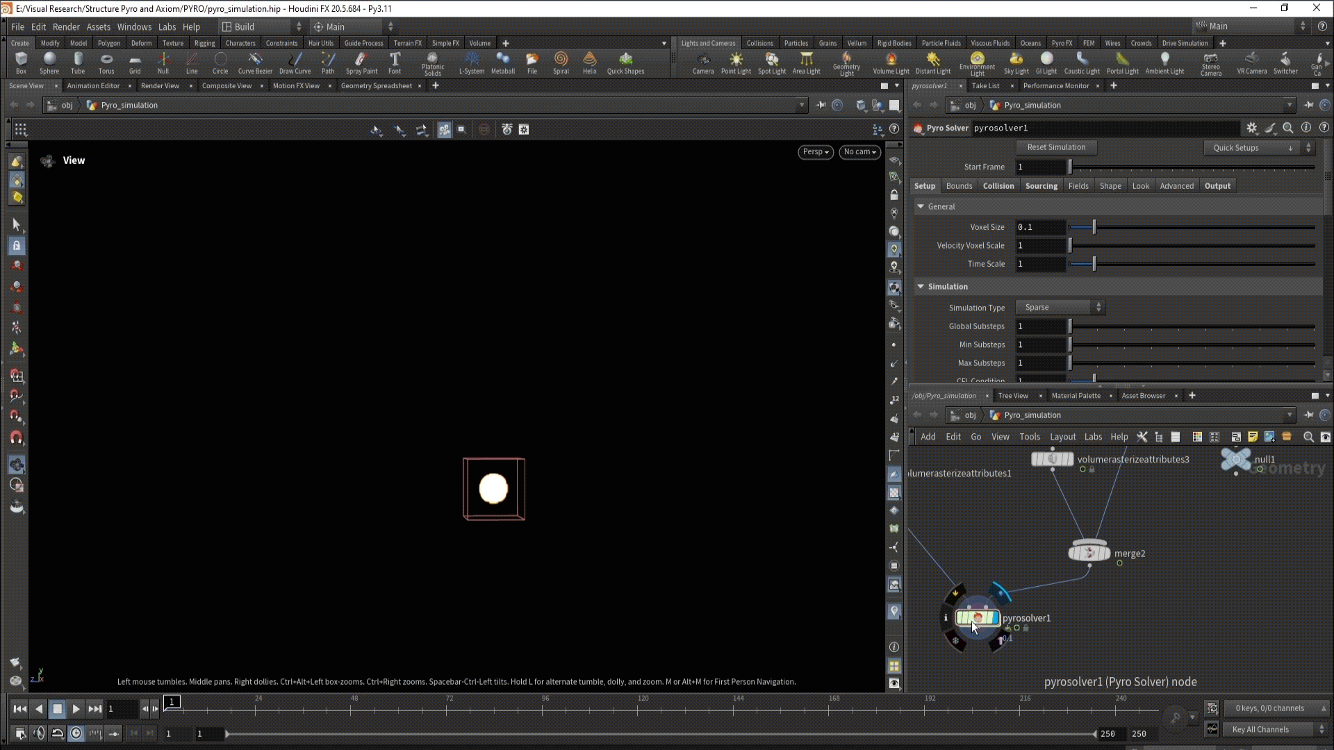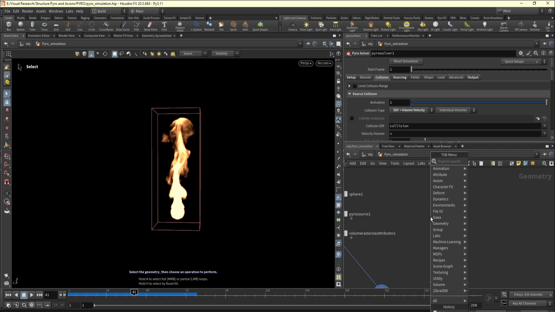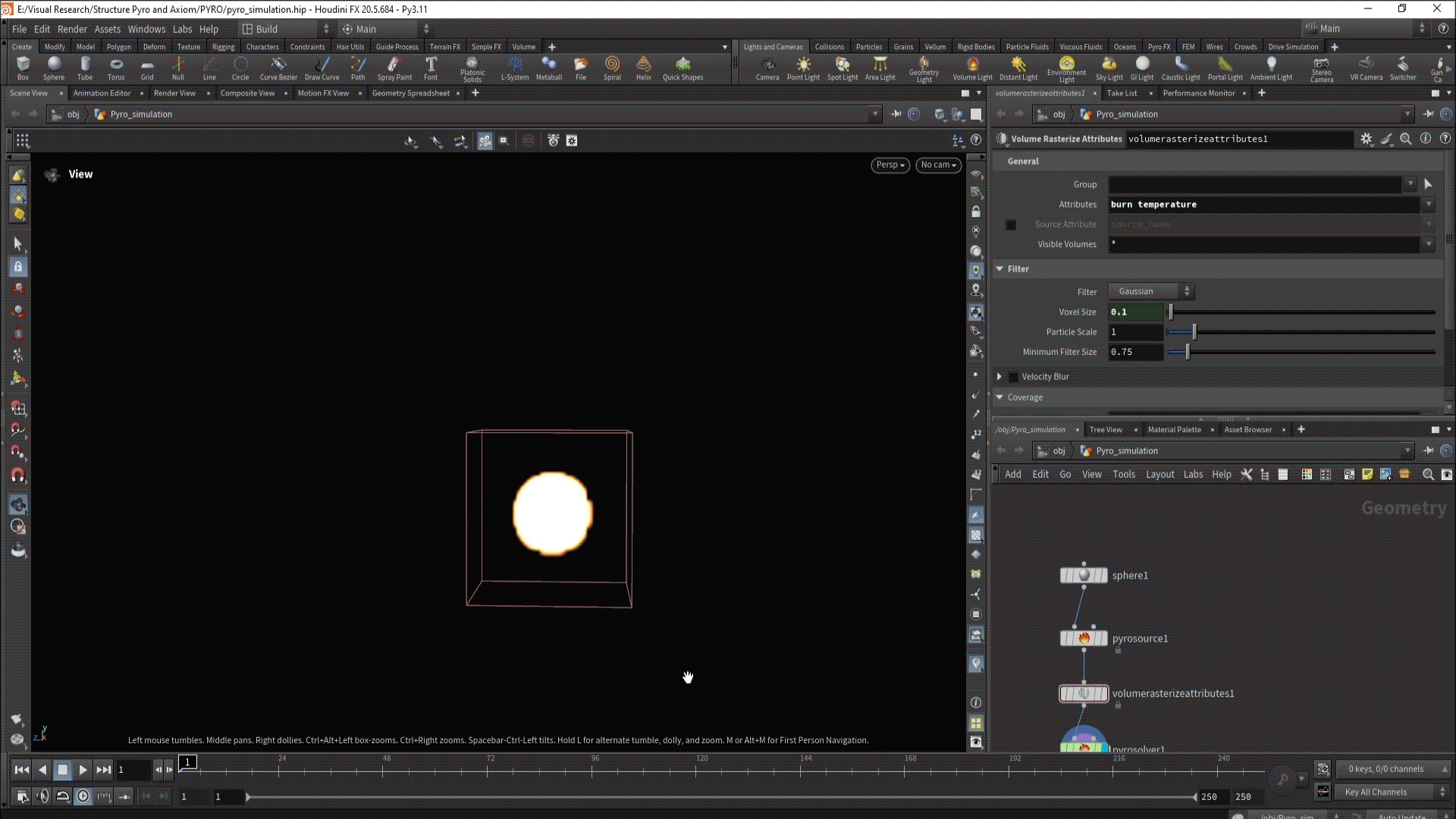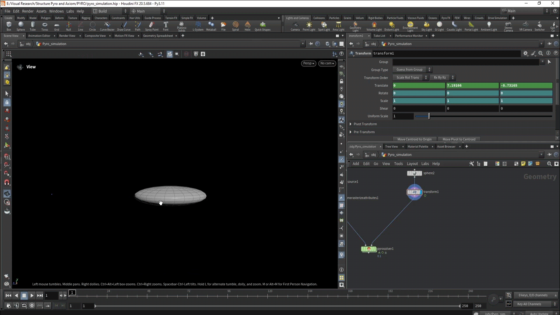 Стандартная сфера применяется в роли геометрии для обнаружения столкновений, а также создаётся непродолжительная анимация, предназначенная для частичного перекрытия пламени. Для одновременного визуального контроля как сферы, так и процесса моделирования, курсор направляется на pyro solver, затем активируется красная стрелка в узле «transform». Формирование ключевых кадров может быть инициировано нажатием на иконку ключа в нижней правой части интерфейса, либо через раздел «translate» в узле, отвечающем за трансформацию геометрии. В указанном разделе, при помощи правой кнопки мыши, выбирается опция «keyframes» и затем «set keyframe».