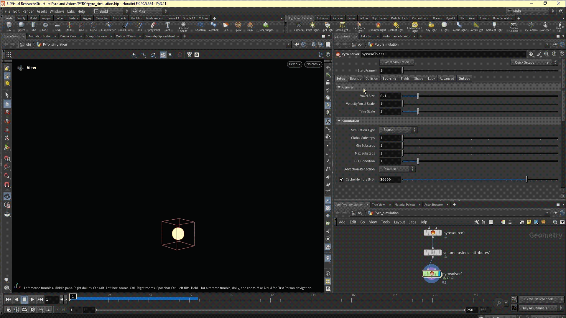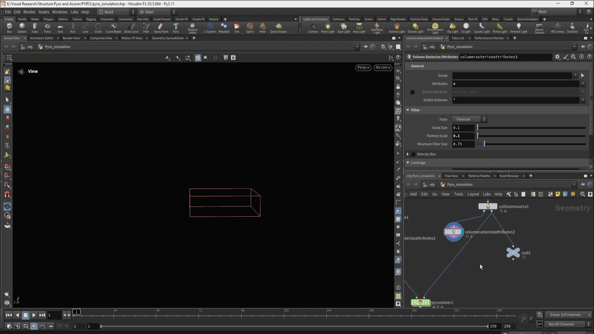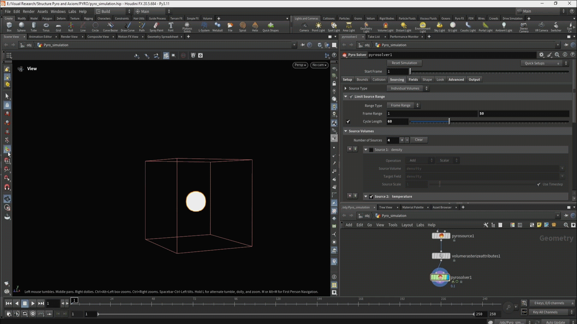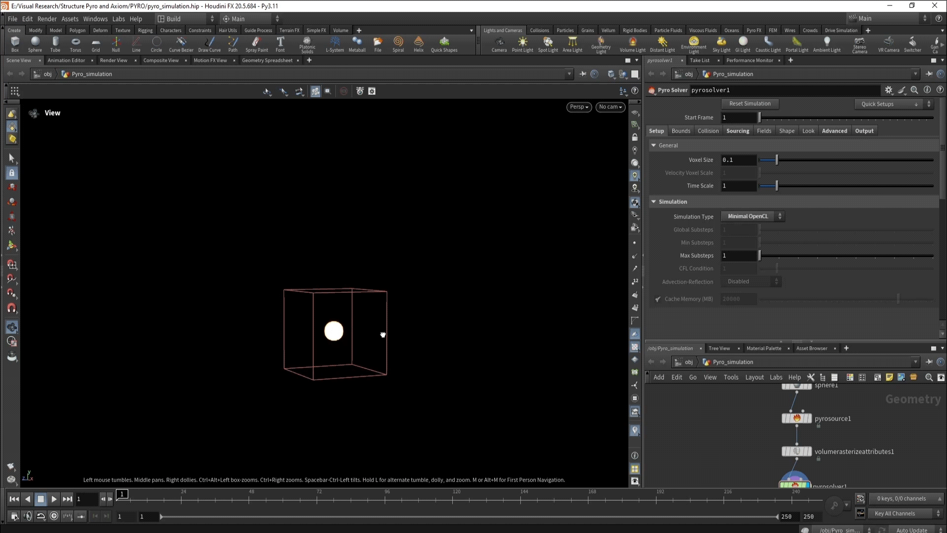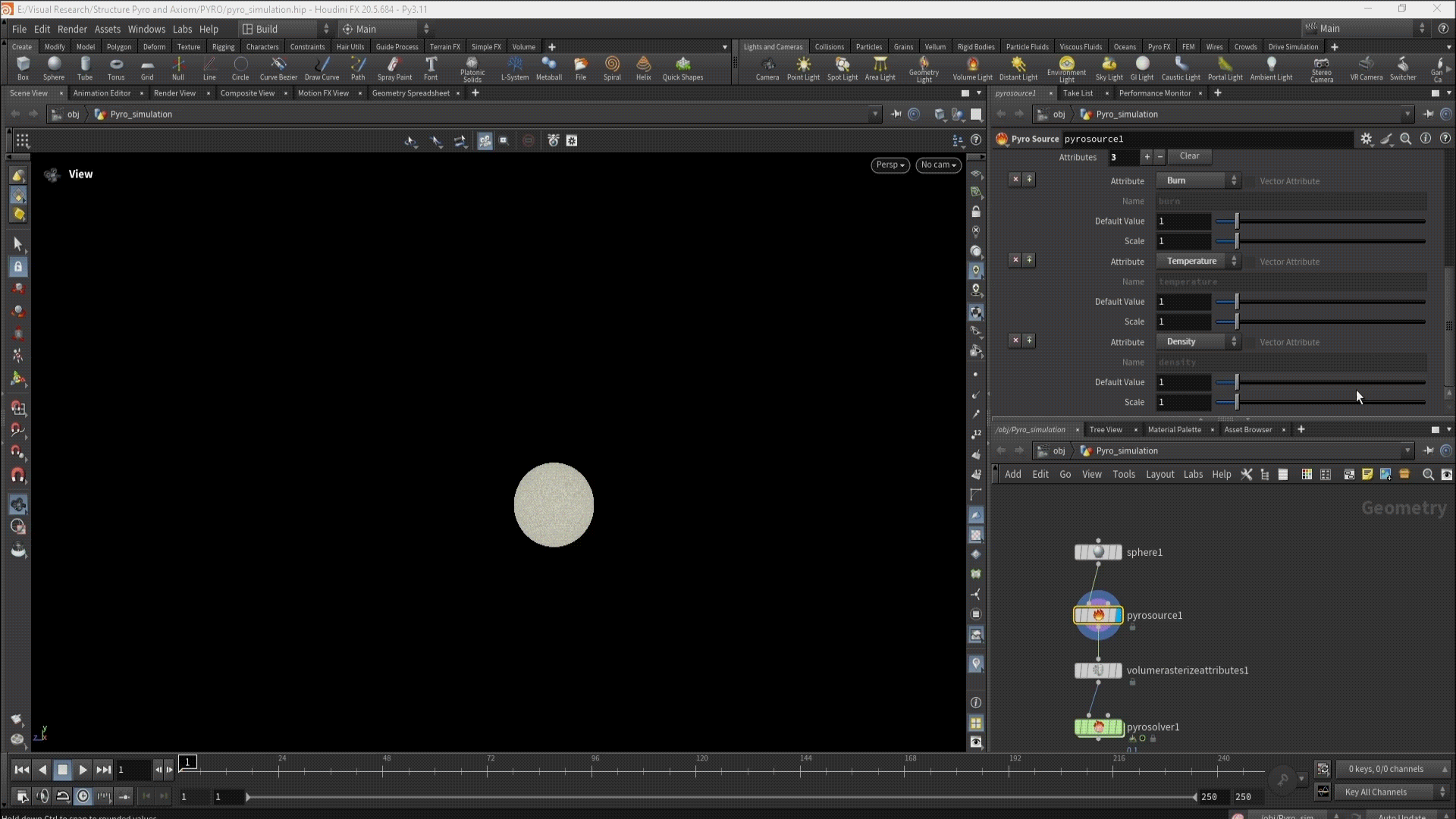 Стандартная сфера применяется в роли геометрии для обнаружения столкновений, а также создаётся непродолжительная анимация, предназначенная для частичного перекрытия пламени. Для одновременного визуального контроля как сферы, так и процесса моделирования, курсор направляется на pyro solver, затем активируется красная стрелка в узле «transform». Формирование ключевых кадров может быть инициировано нажатием на иконку ключа в нижней правой части интерфейса, либо через раздел «translate» в узле, отвечающем за трансформацию геометрии. В указанном разделе, при помощи правой кнопки мыши, выбирается опция «keyframes» и затем «set keyframe».