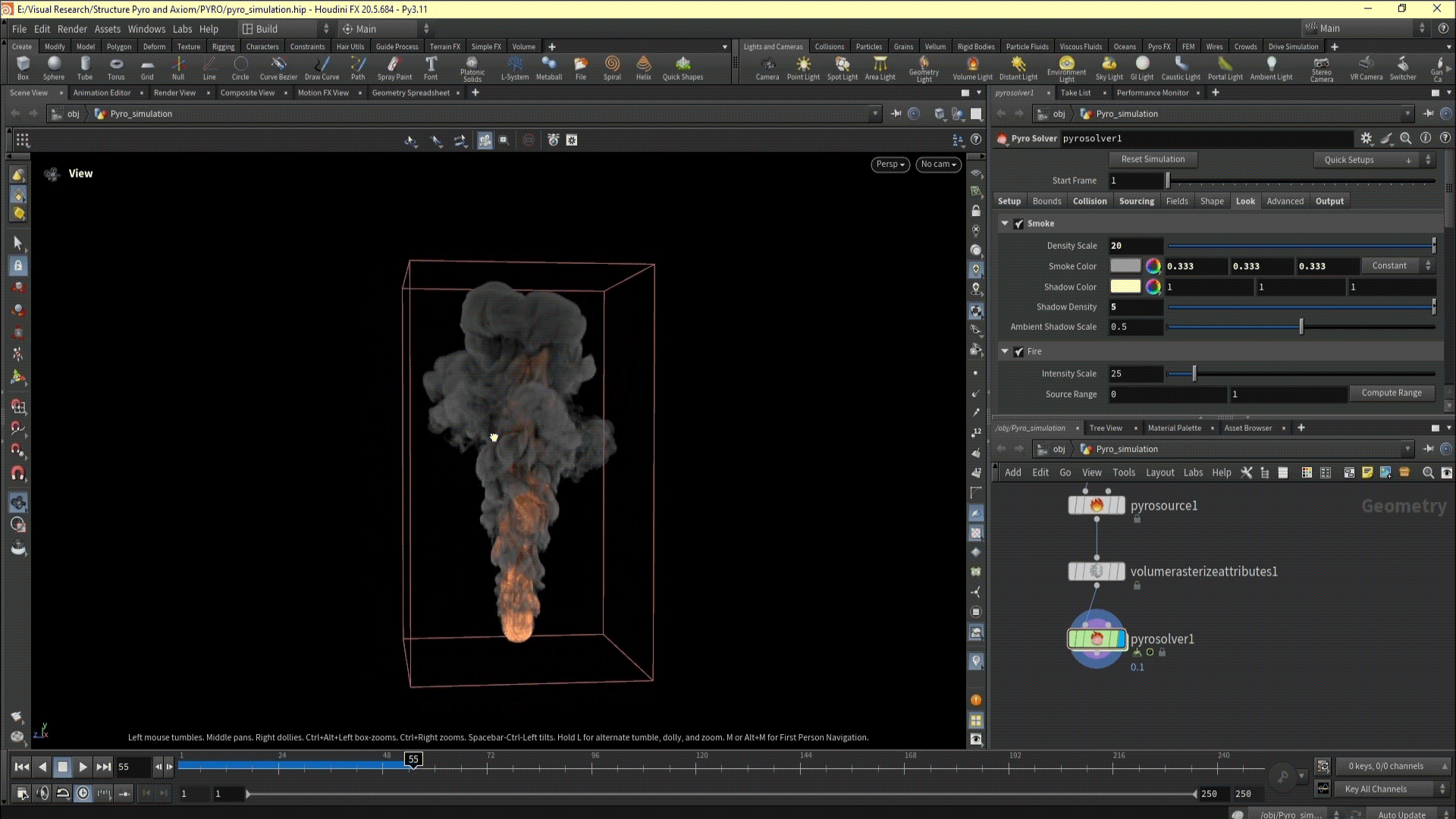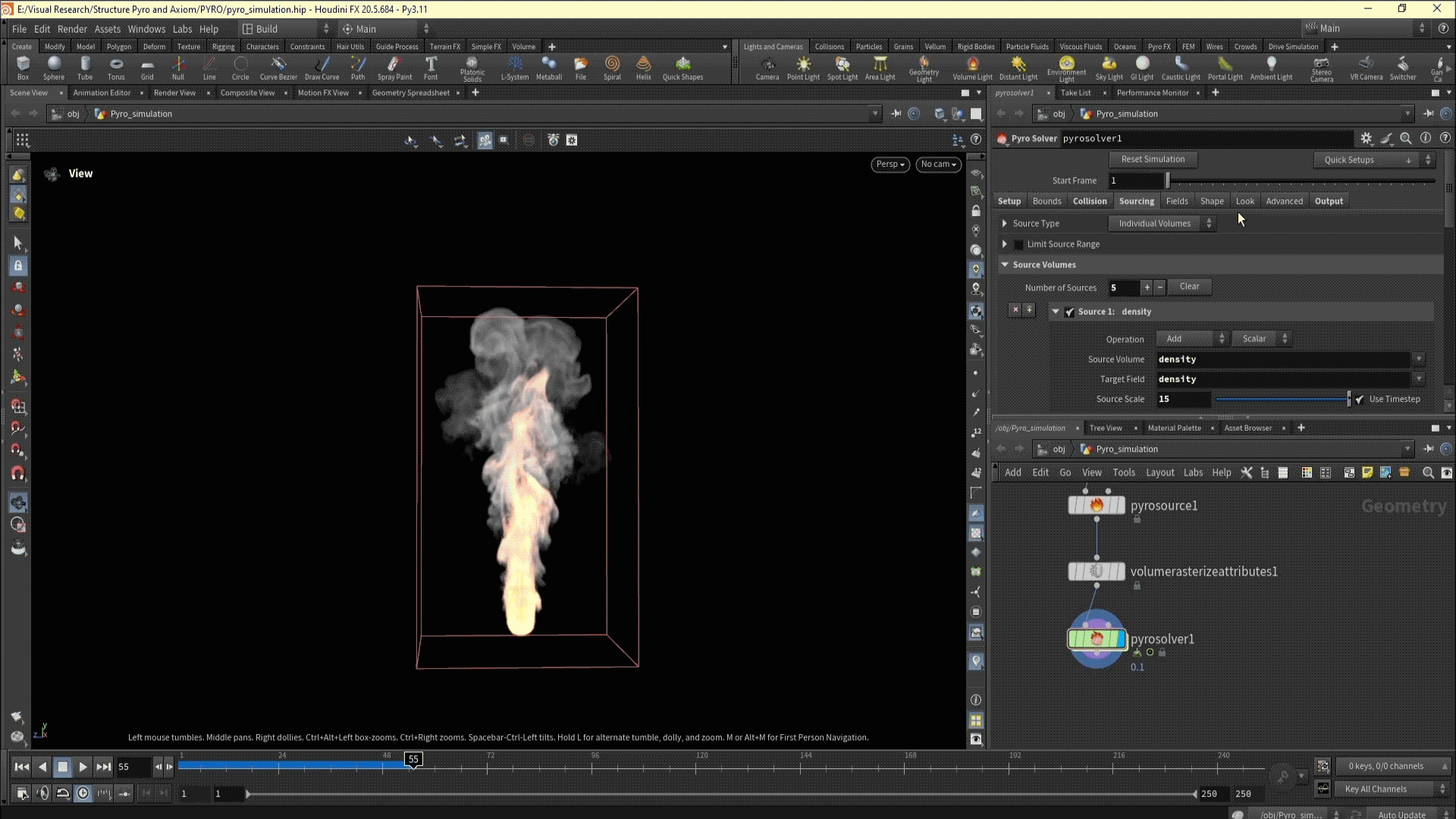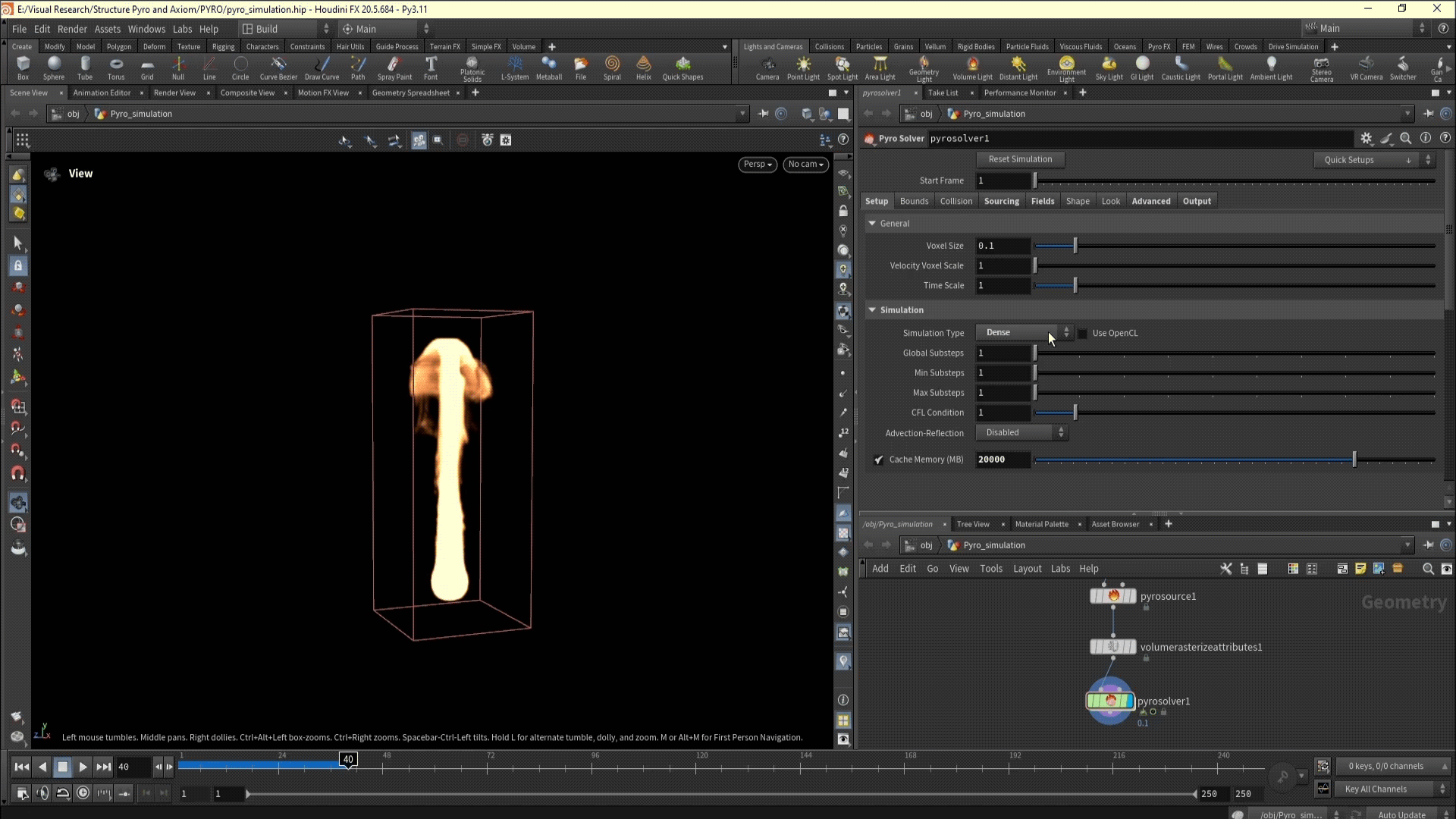 Функционал «Pyro Solver» генерирует пиротехническую симуляцию с возможностью редактирования посредством параметров, описанных ранее. Формируется область пламени, а также эмулируется динамика потоков, обусловленная температурным контрастом, отражая естественное явление восходящего движения нагретого воздуха.
