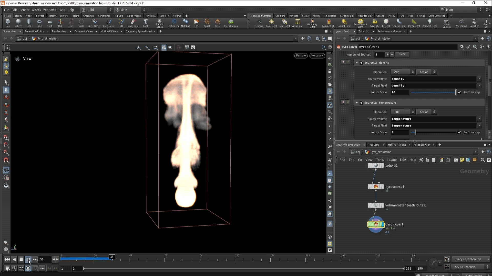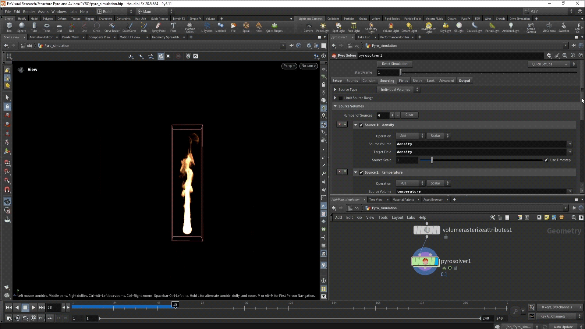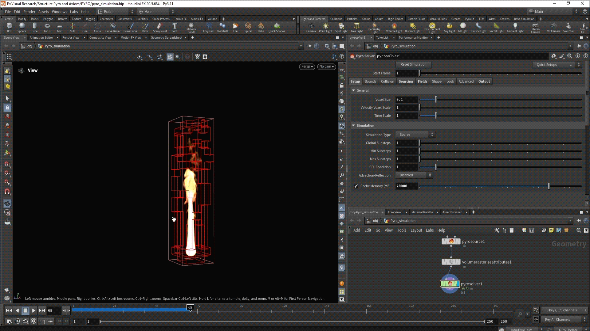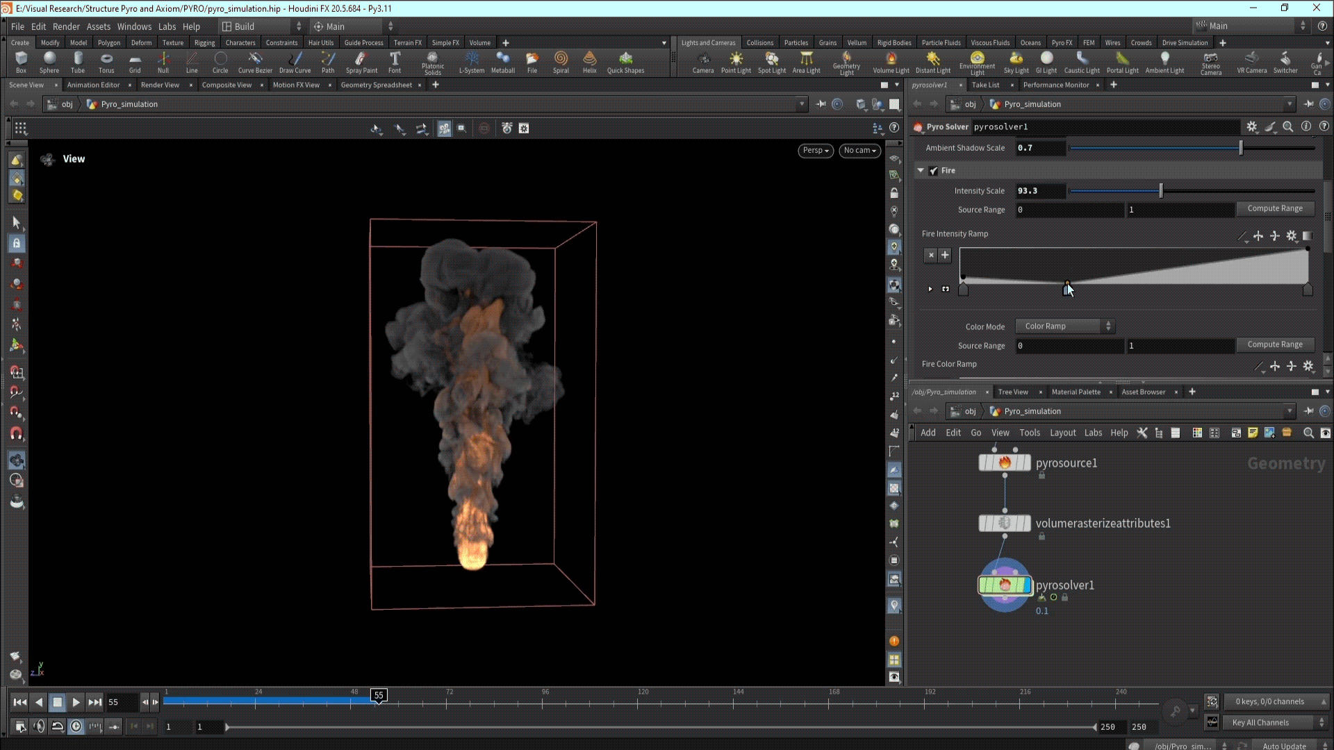 Функционал «Pyro Solver» генерирует пиротехническую симуляцию с возможностью редактирования посредством параметров, описанных ранее. Формируется область пламени, а также эмулируется динамика потоков, обусловленная температурным контрастом, отражая естественное явление восходящего движения нагретого воздуха.