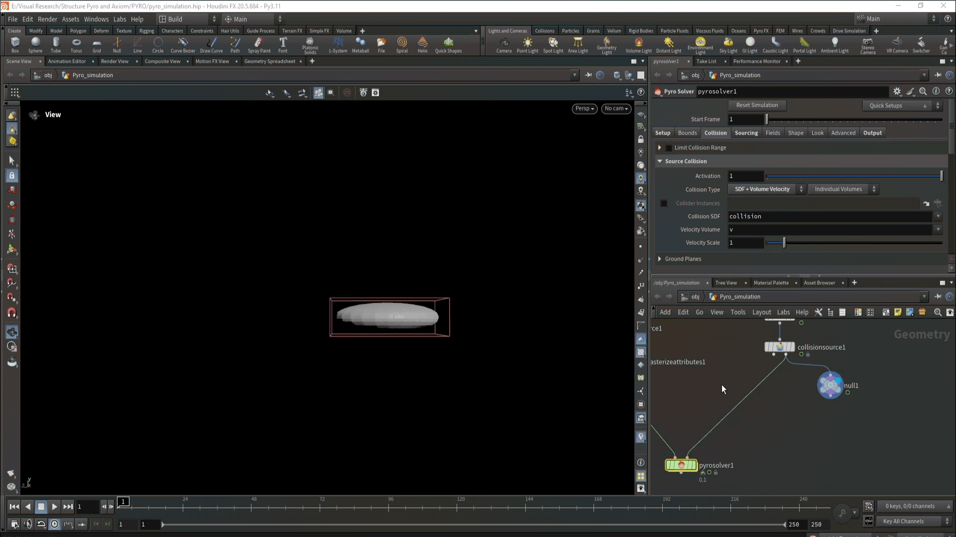Для разрыва соединения между узлами используется сочетание клавиши «Y» и последующее перекрытие соединительной линии. При использовании объема в качестве объекта столкновения, следует убедиться, что в настройках симуляции Pyro вместо параметра «collision geometry» указано «SDF + Volume Velocity». Данная настройка позволяет корректно учитывать объемную коллизию в процессе симуляции.