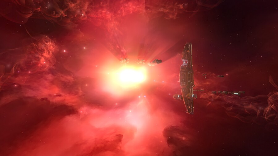 В центре — яркий жёлто-красный «взрыв» в туманности, вокруг — корабли.