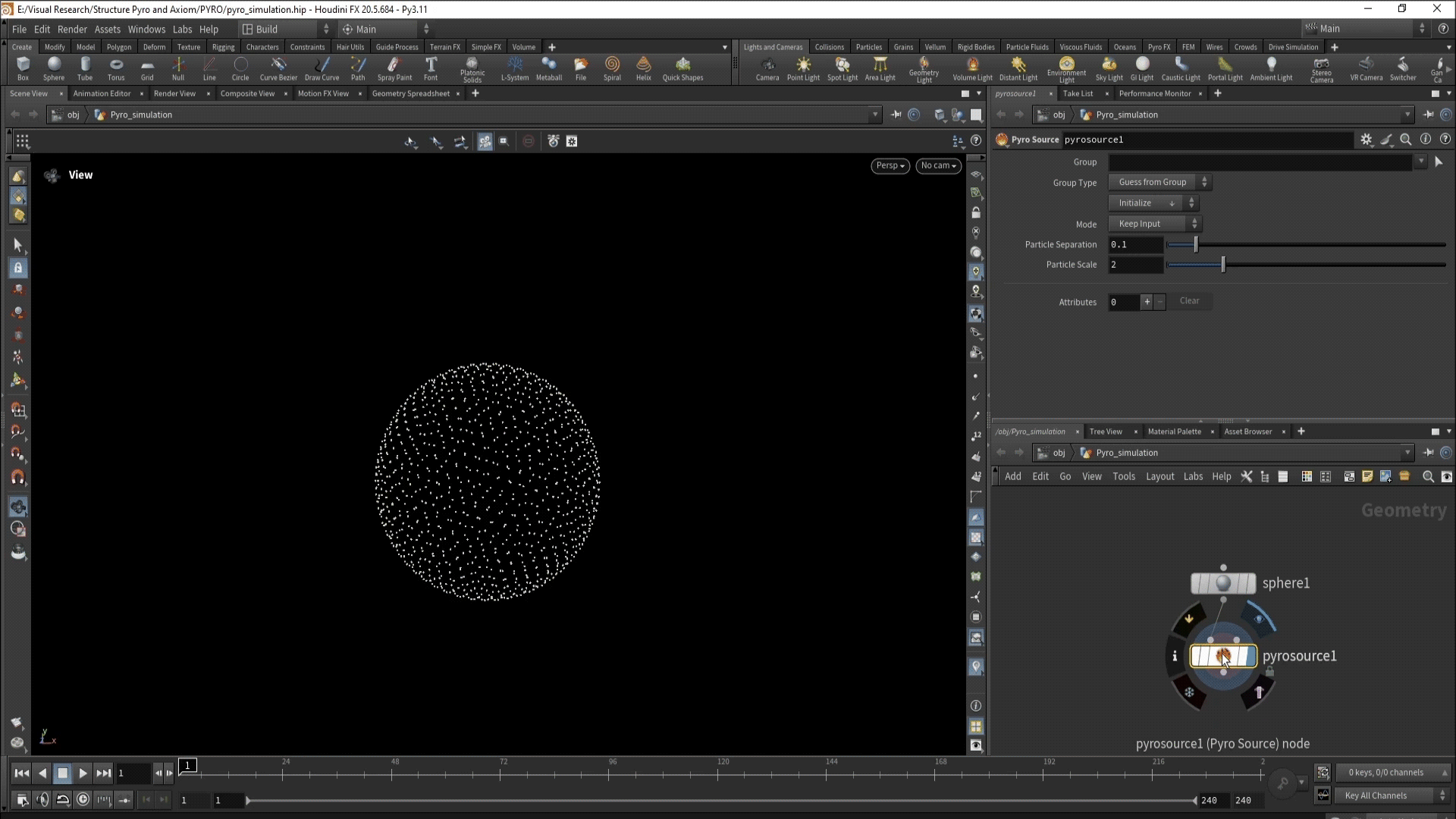Узел «pyro source» предоставляет несколько методов для создания точек на основе геометрии. В данном случае выбран метод рассеивания по поверхности с увеличением количества точек через «particle separation». Однако необходимо рассмотреть все доступные методы и проанализировать их отличия.
