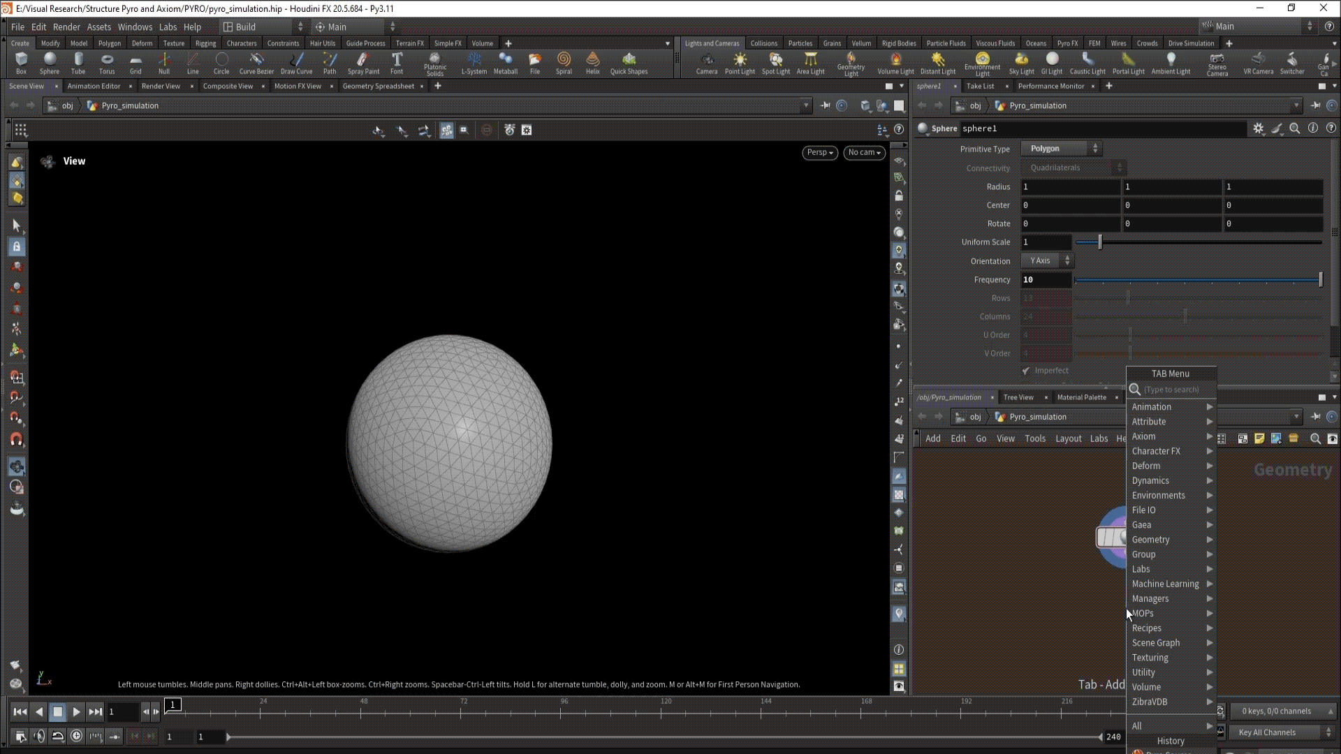 Посредством клавиши «tab» был создан контейнер «geometry», предназначенный для размещения рабочих элементов. Для входа в данную ноду следует дважды щелкнуть по ней, после чего требуется создать сферический объект. Эта операция необходима для генерации точек, которые часто называют эмиттером или источником. В данном контексте эмиттер представляет собой объект, из которого будет исходить дым. В качестве эмиттера была выбрана сфера, как наиболее простой примитив. В завершение был увеличен параметр «frequency» с целью увеличения количества точек, генерируемых из сферы.
