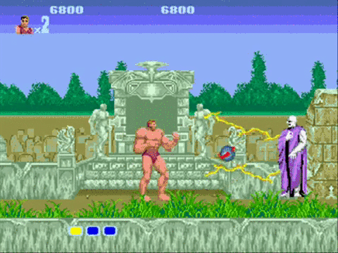 В «Altered Beast» из слабого бойца с короткими атаками герой превращается в мощную звериную форму с уникальными способностями.