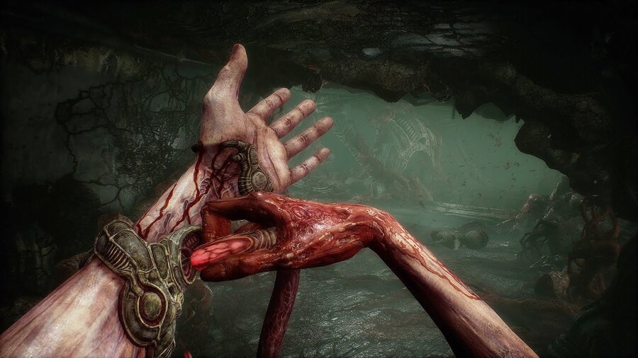 Scorn строит трансформацию не на изменении формы, а на постепенном срастании тела с окружающей биомеханикой. Герой становится частью мира буквально: интерфейсы, двери и механизмы требуют телесного включения, а любое действие оставляет след на плоть игрока.