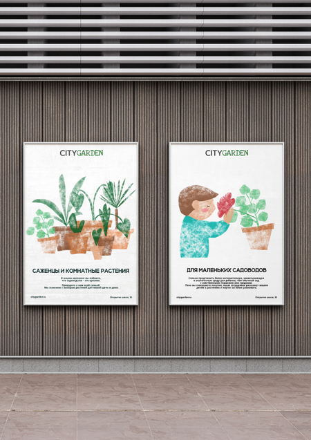 City Garden — сеть магазинчиков садового инвентаря. Переводится как «город-сад», ведь дефис компании «Ощутите себя в городе, как в саду, и городской комфорт на своем садовом участке». Сюда можно и нужно приходить с детьми. Современный, модный и экологичный аналог магазинов «Семена», ориентированный на семьи с детьми. Здесь комфортно находиться с детьми. Пока взрослые выбирают семена, дети играют на тематической площадке, пробуют себя в роли садовода и узнают новое о растениях. В результате работы над концептом был разработан шрифтовой логотип. В идее логотипа соединяются два разных шрифта: City — строгим и ровным гротеском, как дома и улицы города, цвета асфальта, и Garden — написанный будто детской рукой шрифт. В сочетании двух этих шрифтов, будто соединяются город и сад, взрослые и дети. Фирменный стиль построен на иллюстрациях, выполненных в стиле трафарет (работа иллюстратора Сафоновой Марины). Иллюстрации используются как в наружной рекламе, так и в упаковке, мерче, полиграфии. В магазине проводятся занятия с детьми, поэтому разработан дизайн календарей, на которых можно записывать этапы садовых работ. А фирменный набор стикеров порадует детей.