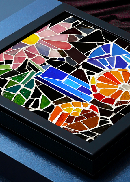 Яркая мозаика из битого стекла. В композиции натюрморта можно рассмотреть крупный розовый цветок с листьями, сочные апельсины и стакан.