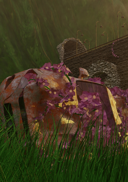 В сцене изображена катастрофа, авария, которая произошла очень давно. Место трагедии спустя много лет поросло густой травой, а цветочные лианы обвили все вокруг. Зритель репереживает ту же аварию, однако видит ее в другом свете. «Больше не страшно. Время лечит», — вот, о чем эта сцена