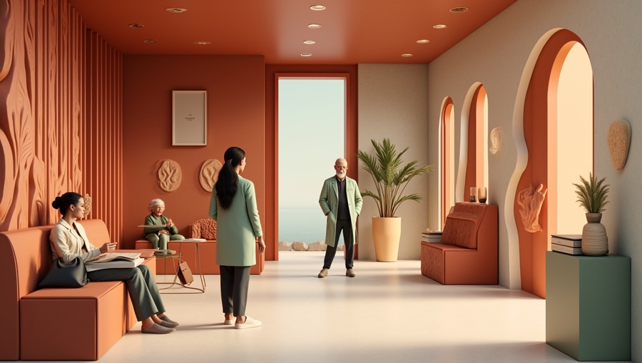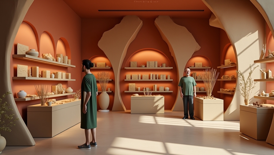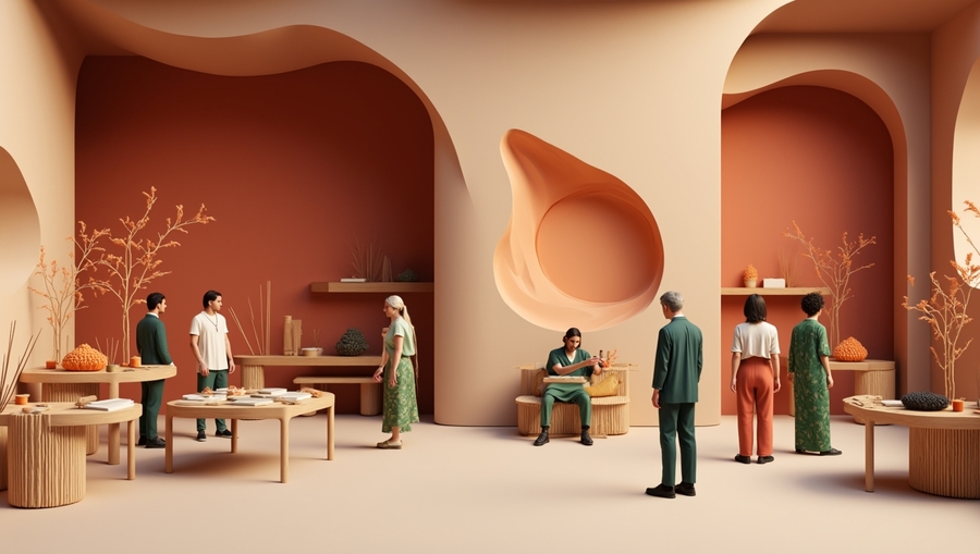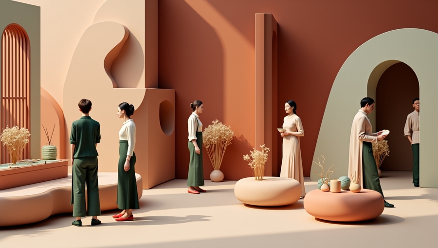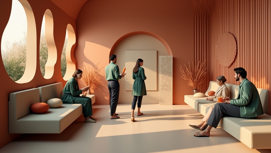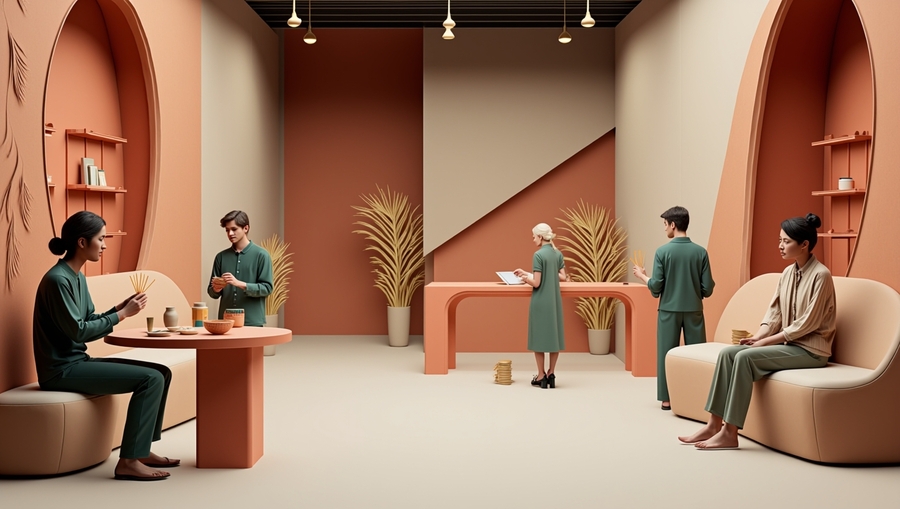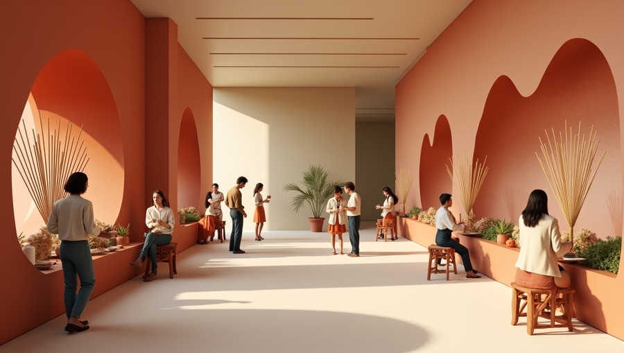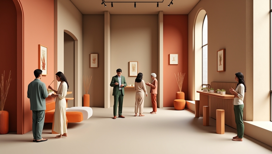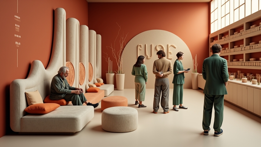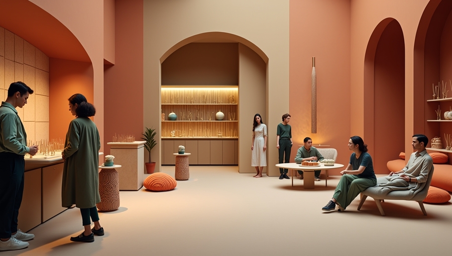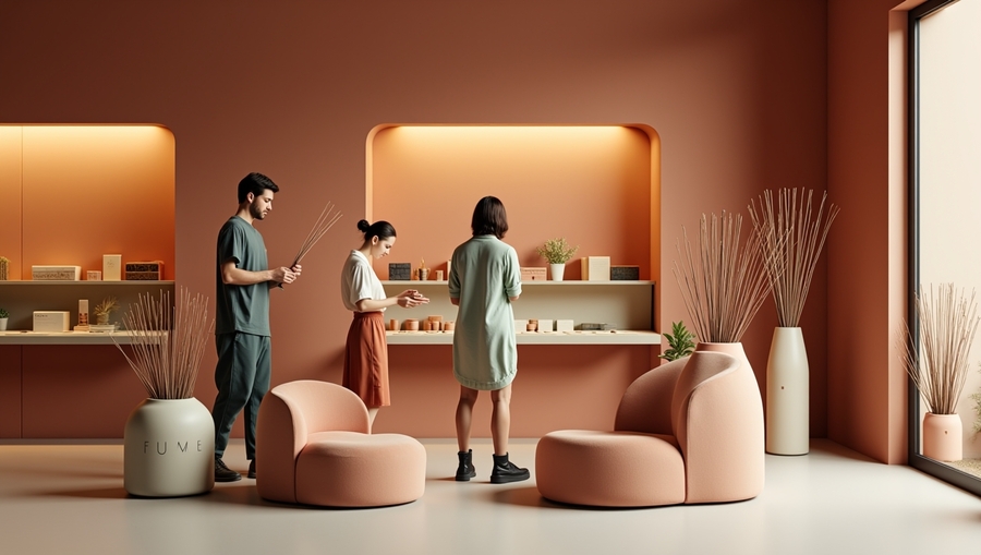Create a visually striking image of a unique space designed for incense tasting, deeply inspired by the packaging aesthetic of the Fume incense brand. Maintain the brand’s color palette of earthy tones, beige, terracotta, and gold accents. Incorporate organic, flowing, and natural forms characteristic of Fume’s packaging into the interior design; these forms should be prominent features, potentially as walls, dividers, or sculptural elements. The space should be designed to facilitate incense tasting, featuring areas for sampling different scents and comfortable minimalist seating. Populate the space with diverse individuals, including young adults, and older men and women, all engaging with the incense. Show them smelling incense, conversing quietly, or browsing the selection of fragrances. The lighting should be soft and inviting, highlighting the textures and colors of the space and the incense itself. Aim for an atmosphere of sophistication, relaxation, and sensory exploration.
