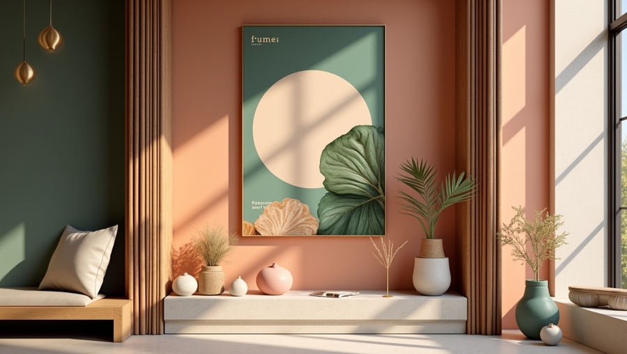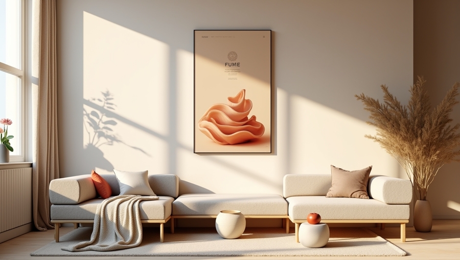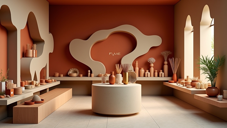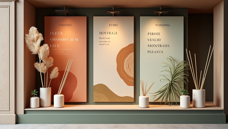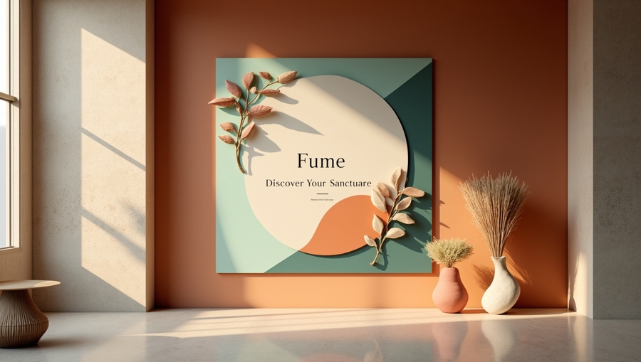 1. Generate images of advertising materials (posters, banners, signage) for the Fume incense brand, placed within interior settings that complement the Fume aesthetic. Maintain the brand’s established color palette (specify colors if known, e.g., «earthy tones, muted pastels, subtle metallics») and incorporate subtle, abstract representations of natural forms, inspired by the organic shapes found on Fume packaging. Use interesting typographic solutions and compelling slogans to convey the essence of the Fume brand: relaxation, sophistication, and connection with nature. Generate an image of Fume signage in a boutique incense shop. The shop should be well-lit, with a focus on natural materials and a sophisticated aesthetic. The signage could be a banner, a poster, or a window display. Incorporate the Fume color palette and subtle, abstract representations of nature. Use the slogan: «Fume: Discover Your Sanctuary.» Try a slightly stylized serif font for an elegant touch.