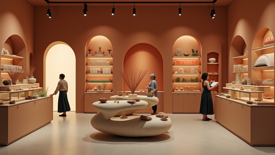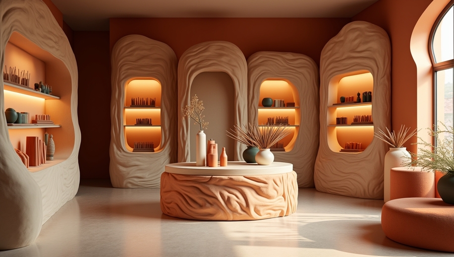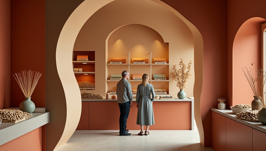 Create a captivating image of an incense shop interior, heavily inspired by the packaging design of the brand Fume. Maintain Fume’s color palette of earthy tones, soft beige, dark terracotta and highlights of gold. Incorporate organic, flowing shapes reminiscent of those found on Fume packaging, using them as architectural elements that seem to envelop the walls. Include display cases showcasing various incense sticks and accessories. Focus on warm, diffused lighting that highlights the natural textures and colors, creating a serene and inviting atmosphere. The overall feeling should be sophisticated and calming. Populate the space with diverse individuals, including young adults, and older men and women, all engaging with the incense.