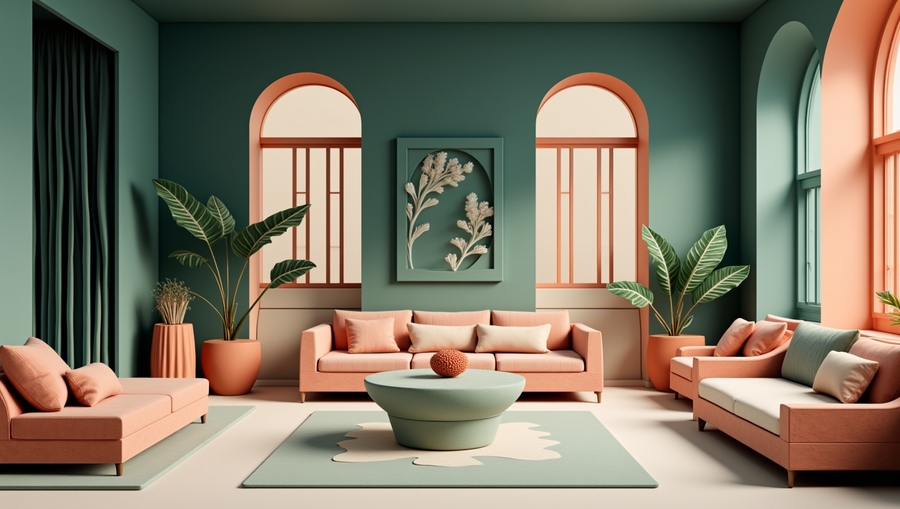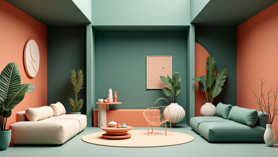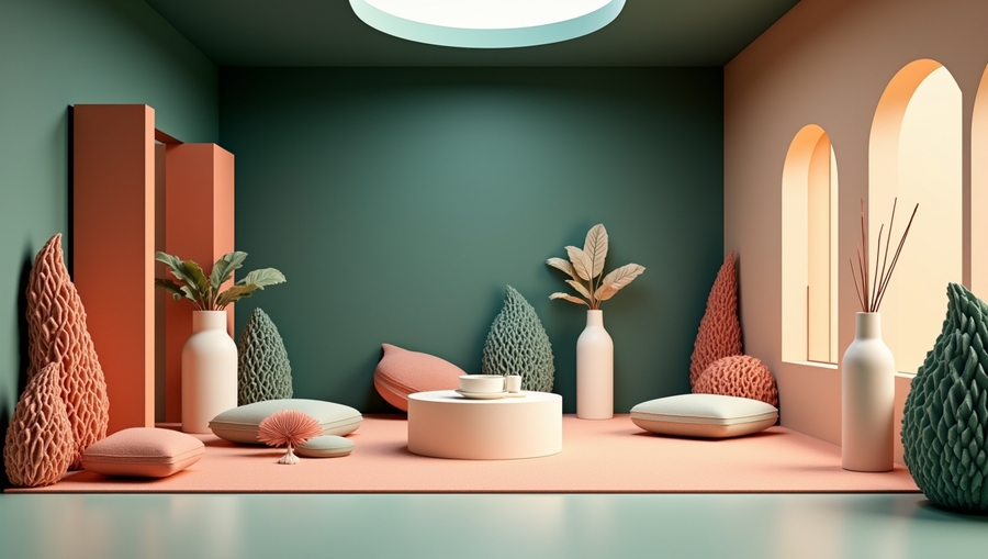Create a captivating and immersive interior space designed as an incense tasting room, deeply inspired by the design language of the Fume brand. Maintain strong adherence to the Fume aesthetic, including the signature teal/dark green color palette, accenting coral/orange tones, and cream/off-white accents. Infuse the space with the same organic, textured forms found on Fume packaging, translating them into architectural elements, furniture, and decor. The space should feel calming, inviting, and inspiring, reflecting the brand’s commitment to self-care, sustainability, and individual expression. It should be a sanctuary where young adults can escape the stresses of daily life and connect with their inner selves. Use a gentle mist to create volume in the interior and atmosphere. The goal is to create a unique and visually stunning interior space that is deeply connected to the brand identity of Fume incense, offering a fresh and innovative interpretation of its core values and design elements.