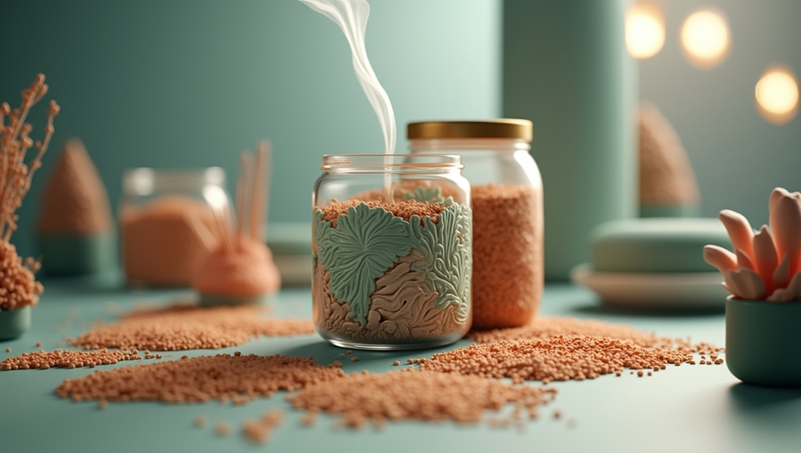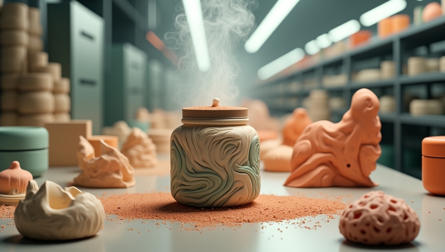 2. Generate a series of images depicting the Fume incense manufacturing facility, visually inspired by the aesthetic of Fume incense packaging. Maintain the brand’s color palette (specify colors if known, e.g., «earthy tones, muted pastels, and subtle metallics»). Integrate organic, flowing forms reminiscent of Fume’s packaging as design elements within the facility’s architecture and equipment. Show a clean, modern environment. Feature specialists and scientists wearing appropriate lab coats and safety gear. Capture the essence of the incense production process, emphasizing precision and care, from raw ingredient preparation to the final packaging of each jar. Provide images with both close-up details and wide shots to showcase the scale and intricacy of the operation. Extreme close-up (macro) image of a single jar of finished Fume incense. Focus on the texture, color, and form of the incense mixture. Highlight the quality and craftsmanship that goes into each jar. Capture a hint of smoke, gently rising from the incense.