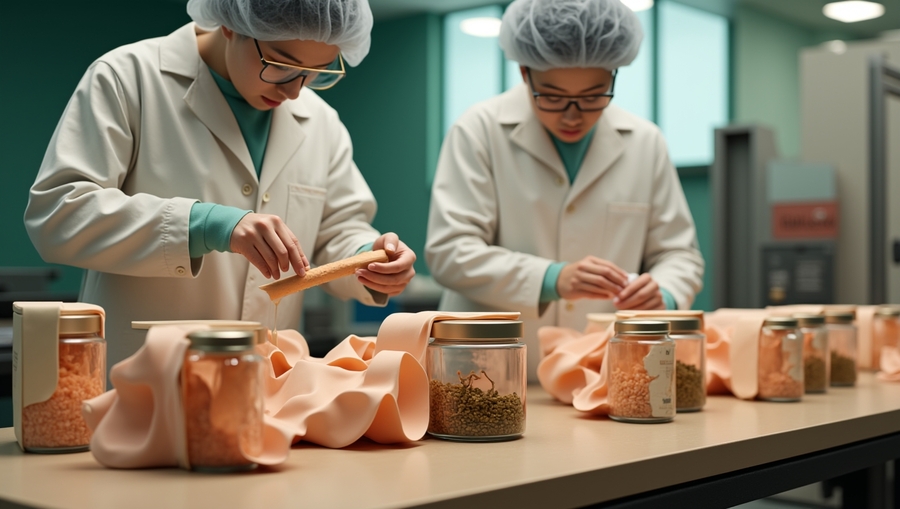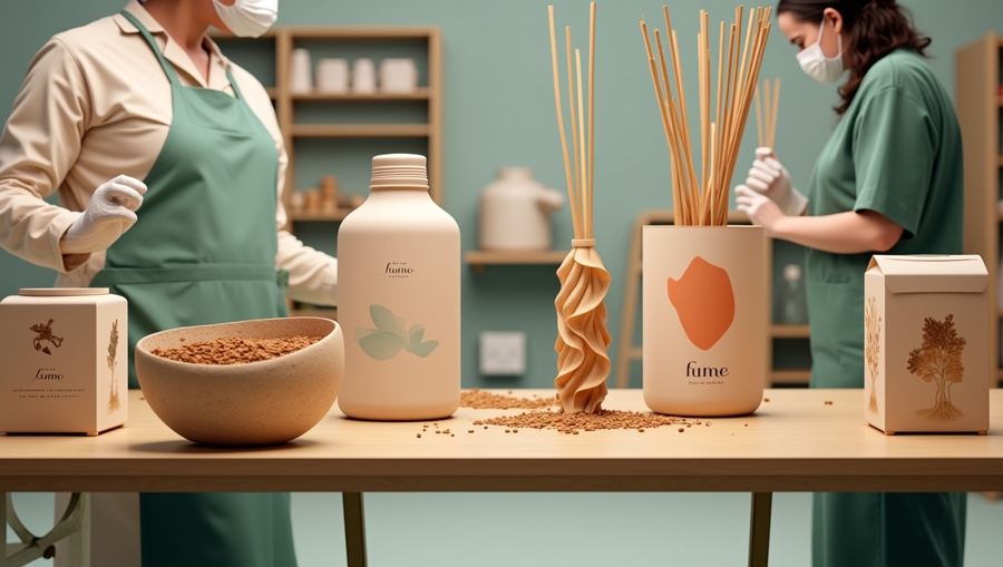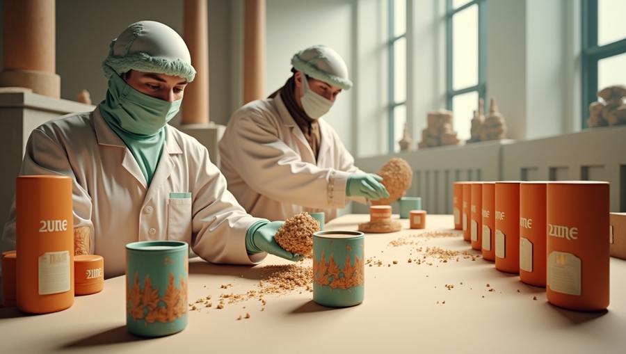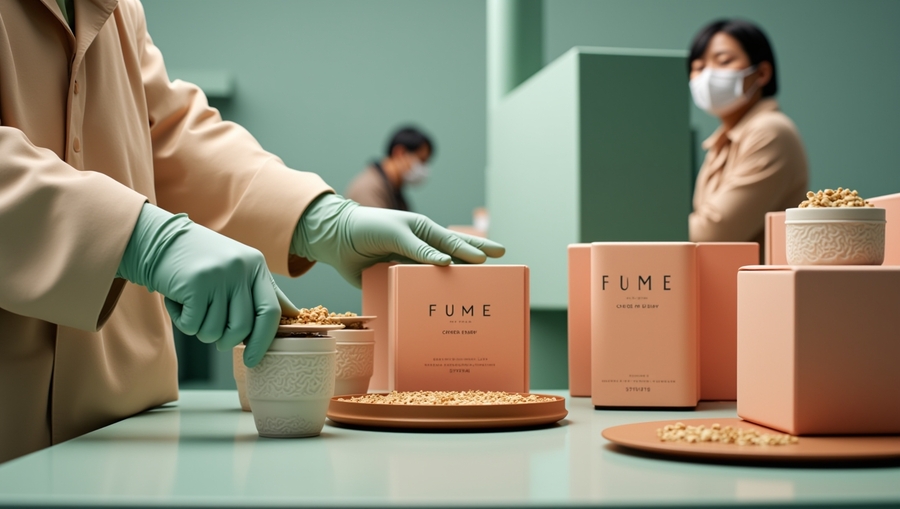 3. Generate a series of images depicting the Fume incense manufacturing facility, visually inspired by the aesthetic of Fume incense packaging. Maintain the brand’s color palette (specify colors if known, e.g., «earthy tones, muted pastels, and subtle metallics»). Integrate organic, flowing forms reminiscent of Fume’s packaging as design elements within the facility’s architecture and equipment. Show a clean, modern environment. Feature specialists and scientists wearing appropriate lab coats and safety gear. Capture the essence of the incense production process, emphasizing precision and care, from raw ingredient preparation to the final packaging of each jar. Provide images with both close-up details and wide shots to showcase the scale and intricacy of the operation. Image of the packaging and jarring process in the Fume facility. Show the meticulous filling of each jar with the finished incense mixture. Focus on the careful labeling and sealing of the jars. Emphasize the clean, sterile environment. Highlight the connection between the raw ingredients and the final, beautifully packaged product. Show the jars being packaged into Fume-branded boxes.