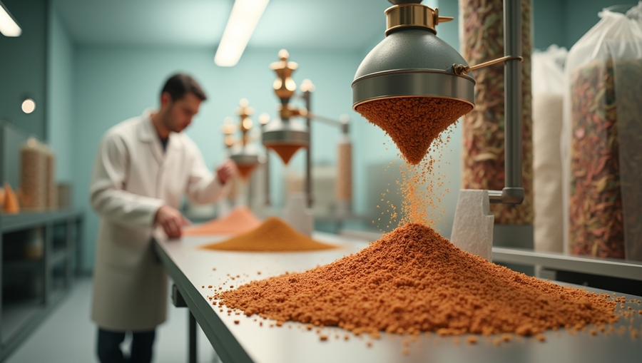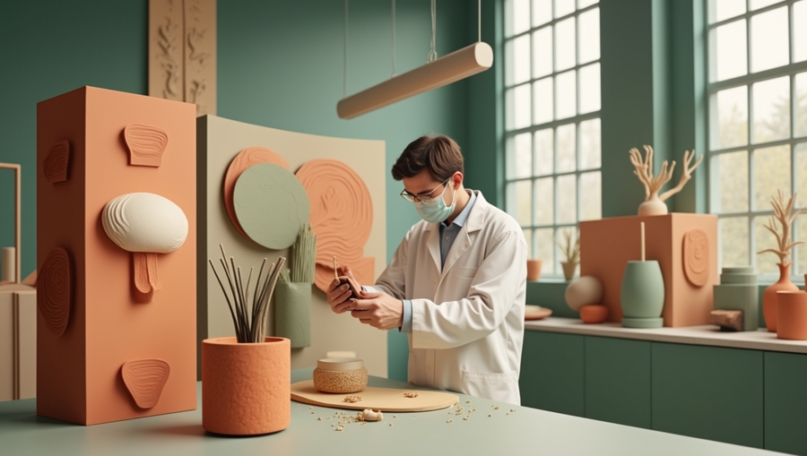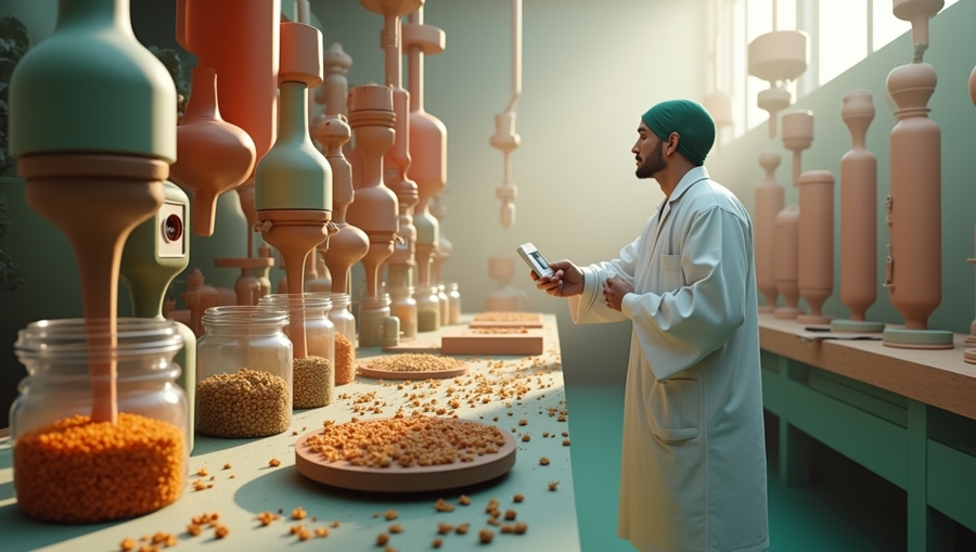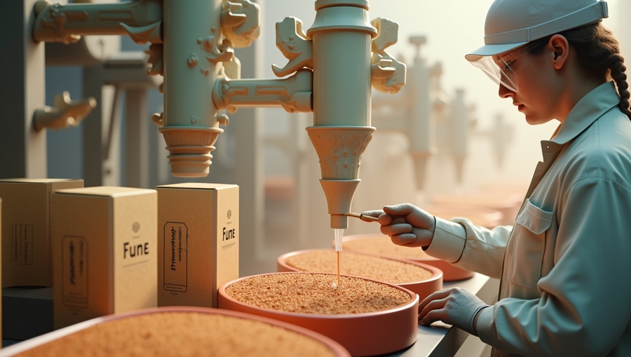 4. Generate a series of images depicting the Fume incense manufacturing facility, visually inspired by the aesthetic of Fume incense packaging. Maintain the brand’s color palette (specify colors if known, e.g., «earthy tones, muted pastels, and subtle metallics»). Integrate organic, flowing forms reminiscent of Fume’s packaging as design elements within the facility’s architecture and equipment. Show a clean, modern environment. Feature specialists and scientists wearing appropriate lab coats and safety gear. Capture the essence of the incense production process, emphasizing precision and care, from raw ingredient preparation to the final packaging of each jar. Provide images with both close-up details and wide shots to showcase the scale and intricacy of the operation. Image of the mixing and blending area in the Fume facility. Show specialized equipment, possibly automated or semi-automated, used to combine the ingredients according to precise formulas. Feature a scientist monitoring the process and adjusting parameters. Emphasize the flowing, organic forms integrated into the equipment design. Capture the interplay of textures and colors as the ingredients are blended.