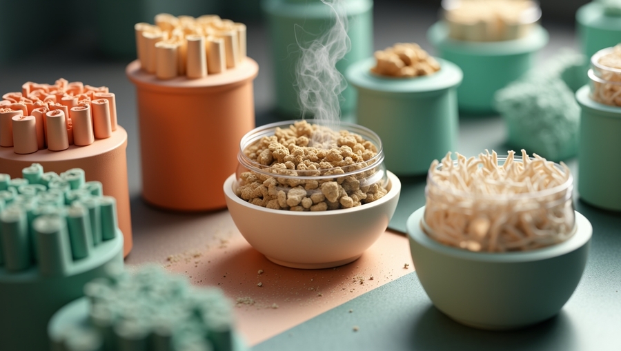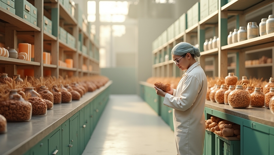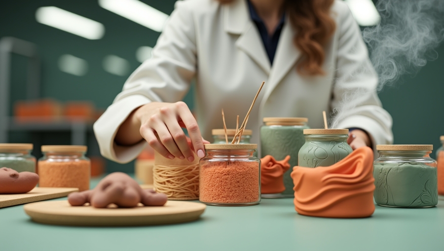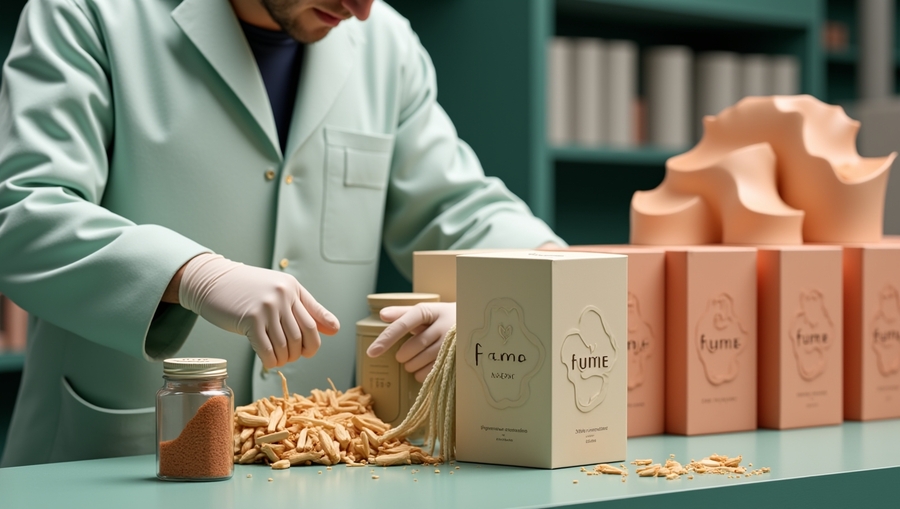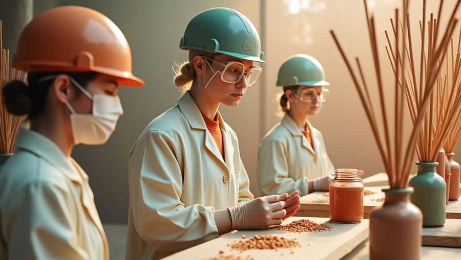 1. Generate a series of images depicting the Fume incense manufacturing facility, visually inspired by the aesthetic of Fume incense packaging. Maintain the brand’s color palette (specify colors if known, e.g., «earthy tones, muted pastels, and subtle metallics»). Integrate organic, flowing forms reminiscent of Fume’s packaging as design elements within the facility’s architecture and equipment. Show a clean, modern environment. Feature specialists and scientists wearing appropriate lab coats and safety gear. Capture the essence of the incense production process, emphasizing precision and care, from raw ingredient preparation to the final packaging of each jar. Provide images with both close-up details and wide shots to showcase the scale and intricacy of the operation.