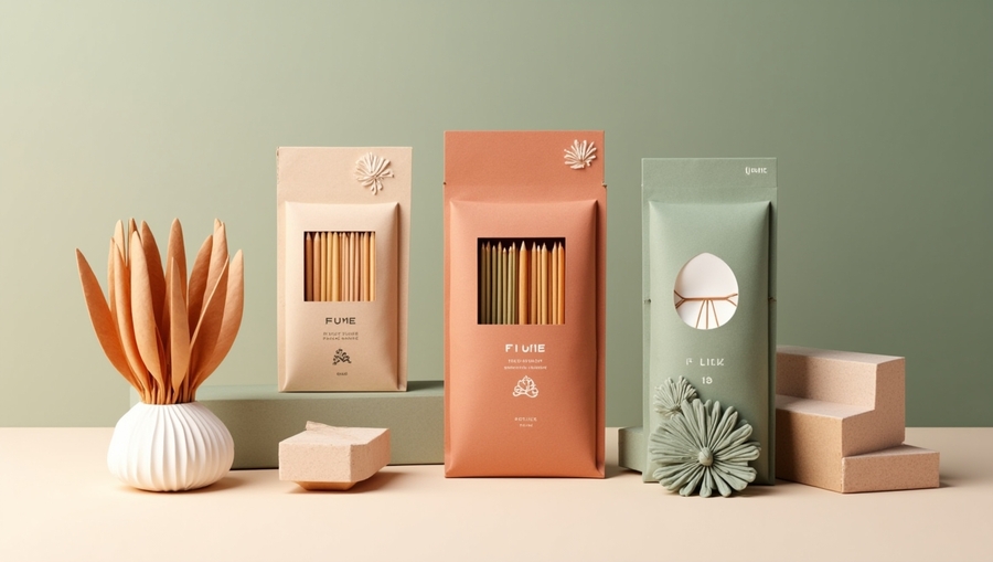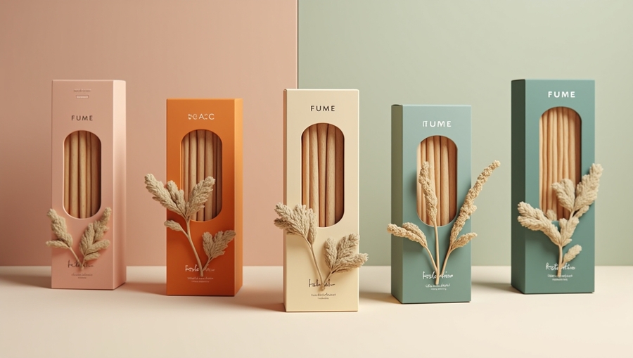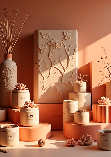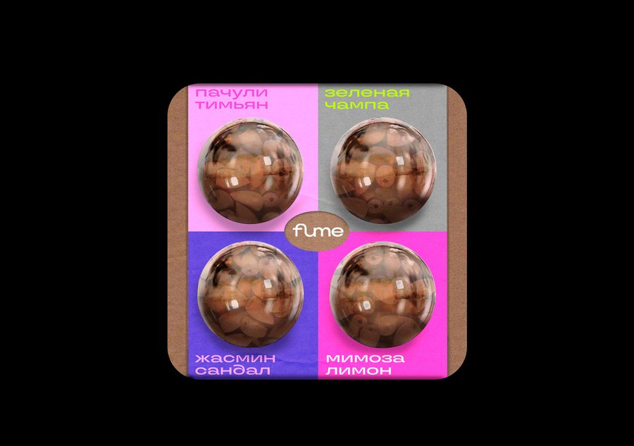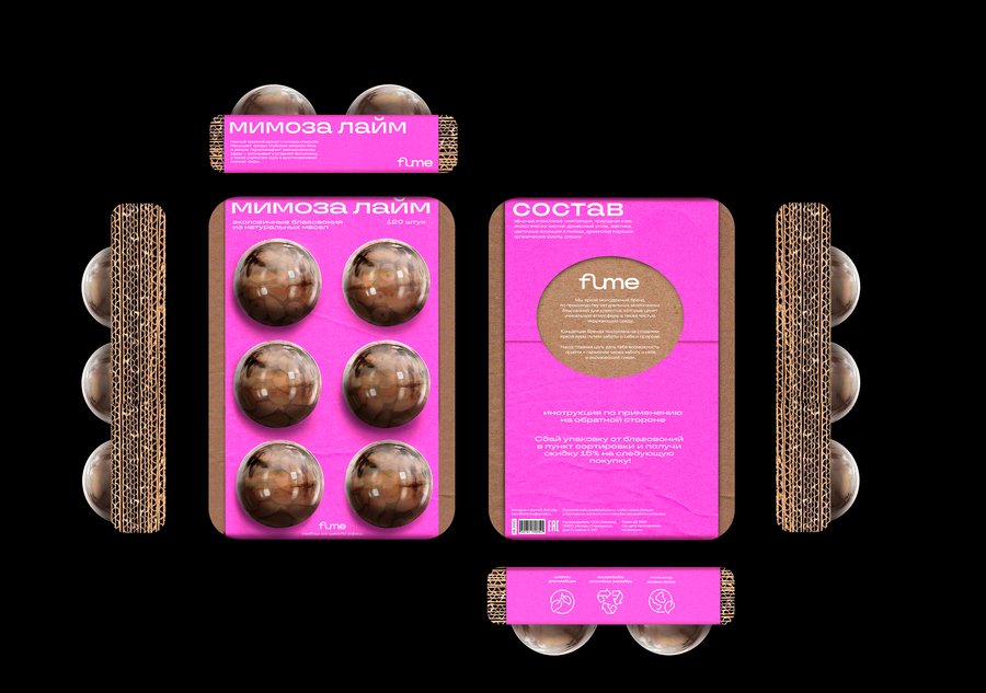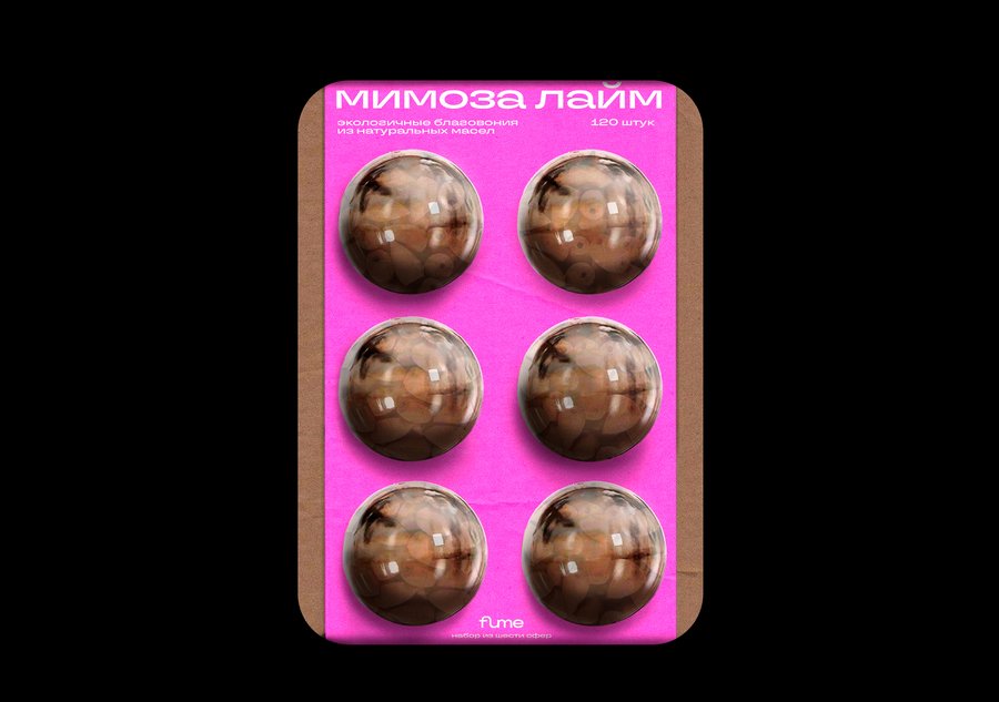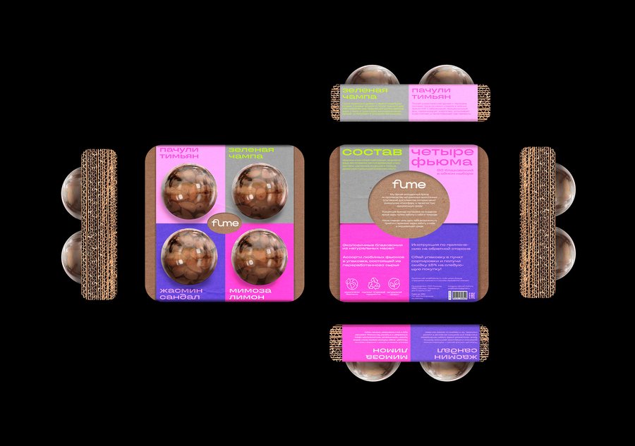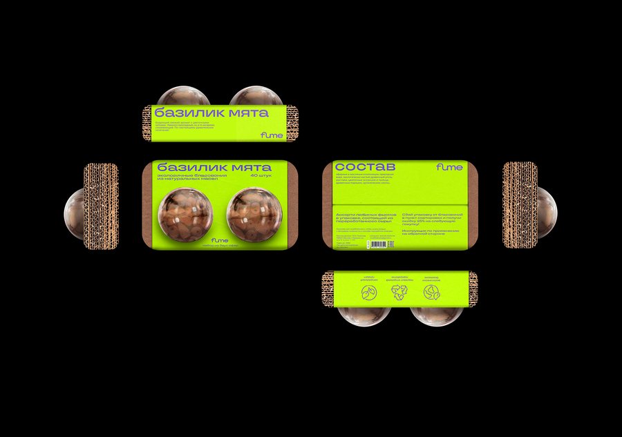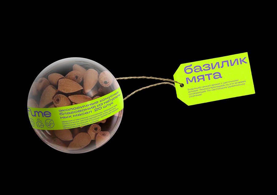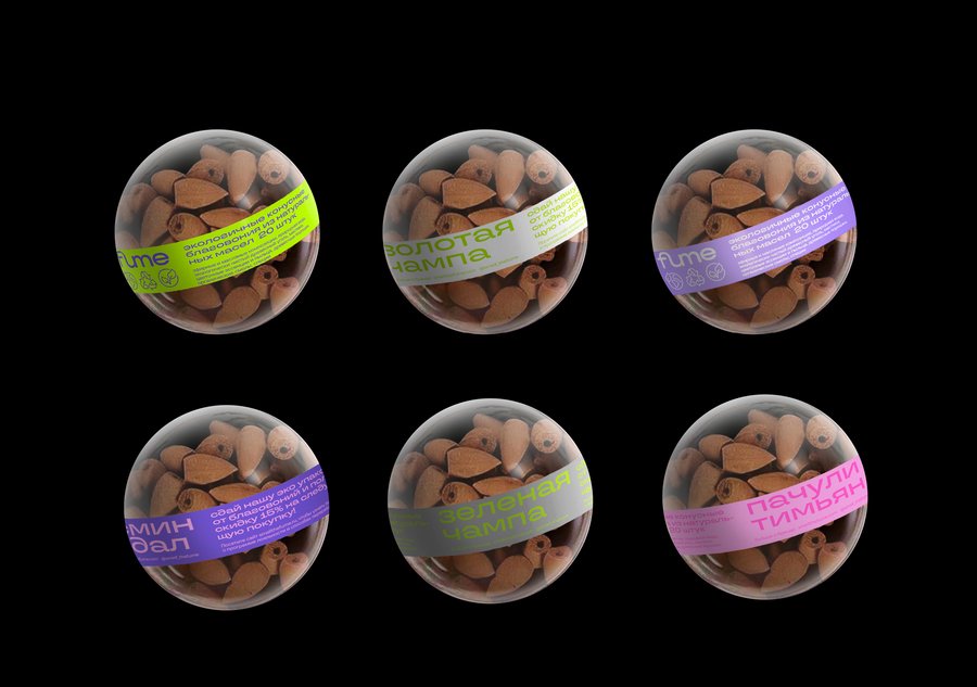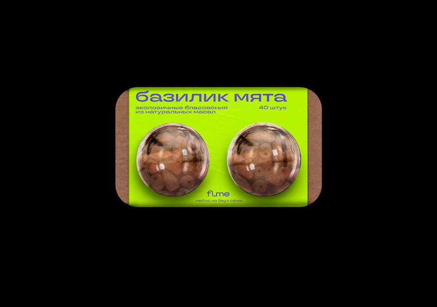 Упаковка экологичных благовоний Fume строится на принципах минимализма и природной эстетики, подчеркивая натуральность продукта. Дизайн украшают объемные, рельефные изображения растений, повторяющие компоненты в составе благовоний, создавая эффект «скульптурной» упаковки.
