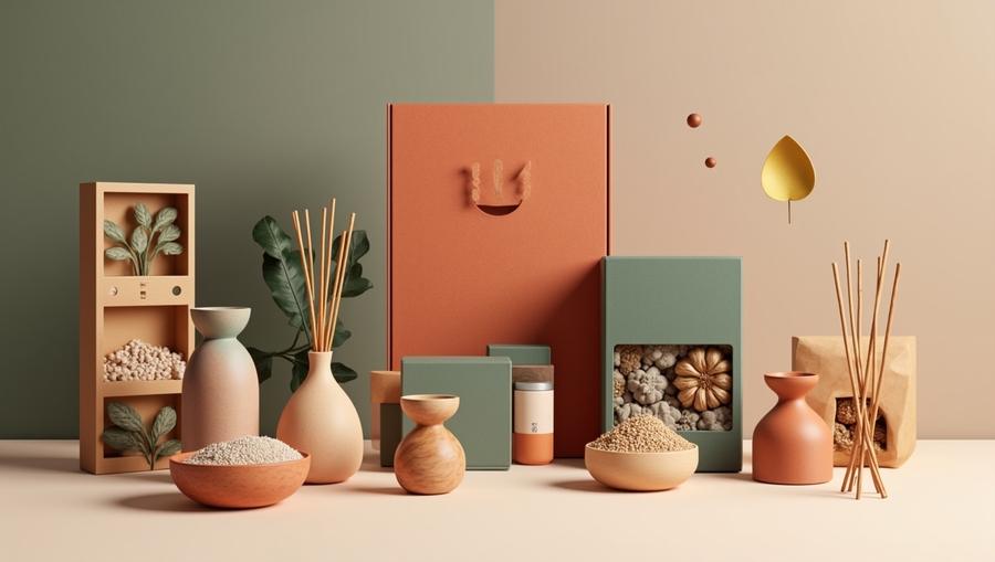 2. Design several new packaging variations for the Fume incense brand, based on the existing Fume packaging aesthetic. Retain the established color palette (specify colors if known, e.g., «earthy tones, muted pastels, subtle metallics») and the signature 3D organic, natural forms that define the Fume brand. The focus should be on creating visually appealing and high-quality packaging that enhances the brand’s sophisticated and natural image. Include a gift set version with a transparent window that showcases the contents inside. Design a premium Fume incense gift set. The set should include multiple jars of incense (different scents), a high-quality incense burner, and possibly other accessories. The gift set packaging should be elegant and luxurious, using high-quality materials like textured paperboard or wood. Incorporate the signature 3D organic forms as a prominent design element. The most important feature is a transparent window that showcases the contents of the set, highlighting the beautiful jars and accessories inside. The color palette should be rich and sophisticated (e.g., dark earth tones with gold accents).