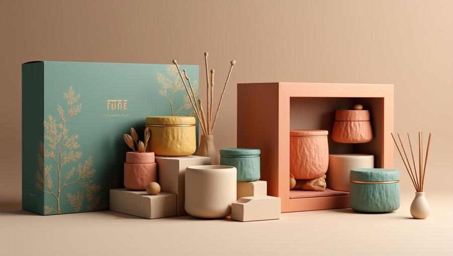 Подарочная упаковка представлялет из себя более премиальное исполнение из плотного картона с тиснением или рельефным изображением растений, связанных с ароматом. Часто комплектуется дополнительными аксессуарами: подставками и держателями. Может быть набором из нескольких ароматов. Отличается более сложной и изысканной отделкой.