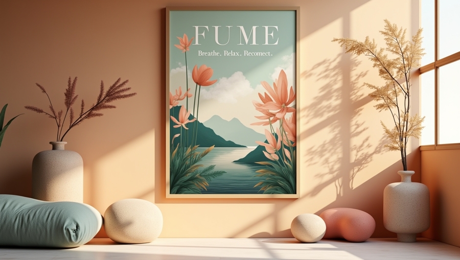2. Generate images of advertising materials (posters, banners, signage) for the Fume incense brand, placed within interior settings that complement the Fume aesthetic. Maintain the brand’s established color palette (specify colors if known, e.g., «earthy tones, muted pastels, subtle metallics») and incorporate subtle, abstract representations of natural forms, inspired by the organic shapes found on Fume packaging. Use interesting typographic solutions and compelling slogans to convey the essence of the Fume brand: relaxation, sophistication, and connection with nature. Create an image of a Fume poster displayed in a yoga or meditation studio. The studio should be serene and inviting, with natural light and a focus on tranquility. The poster should feature a soothing image inspired by nature (e.g., flowing water or a forest landscape). Incorporate the Fume color palette and use the slogan: «Fume: Breathe. Relax. Reconnect.» Use a flowing, calligraphic font for a peaceful feel.
