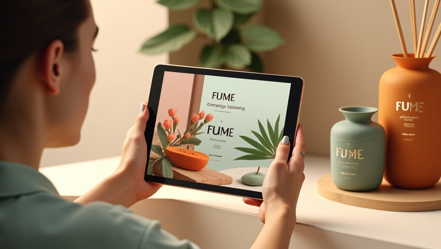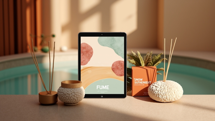 3. Generate images of advertising materials (posters, banners, signage) for the Fume incense brand, placed within interior settings that complement the Fume aesthetic. Maintain the brand’s established color palette (specify colors if known, e.g., «earthy tones, muted pastels, subtle metallics») and incorporate subtle, abstract representations of natural forms, inspired by the organic shapes found on Fume packaging. Use interesting typographic solutions and compelling slogans to convey the essence of the Fume brand: relaxation, sophistication, and connection with nature. Create an image of a digital Fume advertisement displayed on a tablet in a spa setting. The spa should be luxurious and relaxing, with soft lighting and natural elements. The ad should feature a short, animated video showcasing the Fume incense and its benefits. Use the slogan: «Fume: Sensory Serenity.» Keep the design clean and uncluttered.