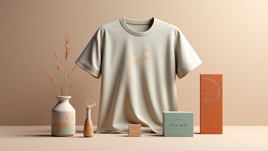1. Design a range of merchandise for the Fume incense brand. Maintain the established Fume color palette (specify colors if known, e.g., «earthy tones, muted pastels, subtle metallics») and incorporate subtle, abstract representations of natural forms, inspired by the organic shapes found on Fume packaging. The merchandise should be stylish, understated, and reflect the brand’s sophisticated and natural aesthetic. Focus on creating designs that appeal to a discerning customer who appreciates high quality and subtle branding. Design a t-shirt for the Fume incense brand. The t-shirt should be a high-quality, comfortable fabric. The design should be minimalist and subtle. Incorporate the Fume color palette (e.g., a soft beige or muted gray). Feature a small, abstract representation of flowing smoke or a simplified version of the Fume logo on the chest or sleeve. Avoid large, bold graphics. Prioritize a clean and sophisticated look.