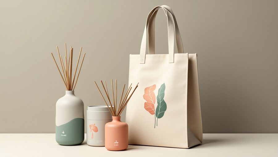 Фирменные носители Fume, выполненные из натуральных и переработанных материалов в спокойных природных оттенках, включают в себя одежду из органического хлопка и льна, шопперы из джута, а также минималистичные аксессуары для дома и благовоний из дерева и керамики, отражая ценности осознанного потребления, экологичности и гармонии с природой.