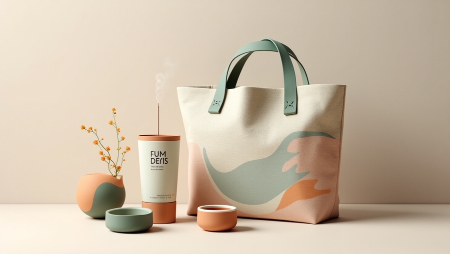 3. Design a range of merchandise for the Fume incense brand. Maintain the established Fume color palette (specify colors if known, e.g., «earthy tones, muted pastels, subtle metallics») and incorporate subtle, abstract representations of natural forms, inspired by the organic shapes found on Fume packaging. The merchandise should be stylish, understated, and reflect the brand’s sophisticated and natural aesthetic. Focus on creating designs that appeal to a discerning customer who appreciates high quality and subtle branding. Design a tote bag for the Fume incense brand. The tote bag should be made from durable, eco-friendly material (e.g., canvas or recycled cotton). Design an incense holder for the Fume incense brand. The holder should be made from natural materials such as wood or ceramic. Incorporate organic shapes and colors.
