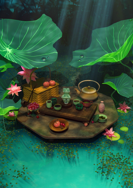 Где-то среди раскинувшихся листьев лотоса скрывается нефритовая лягушка, хозяйка чайных церемоний. Аромат сладких угощений и заботливо приготовленного чая застыл в дымке пробивающихся к столу солнечных лучей.