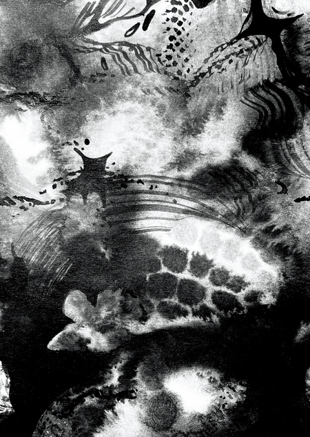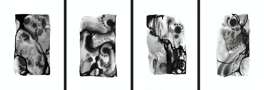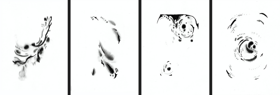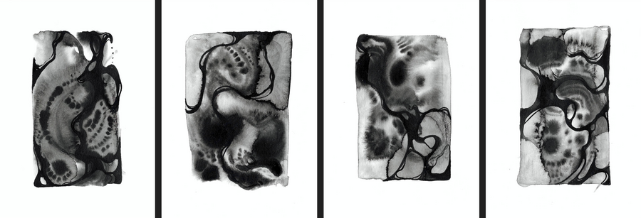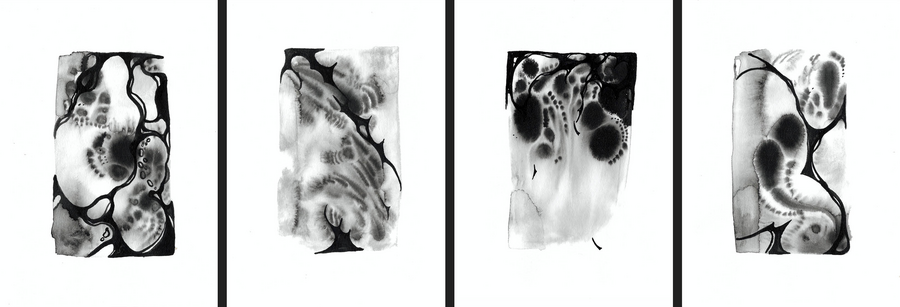 Я устала. Устала и от того, что всё время мне что-то не нравится, от того, что у меня не получается ничего придумать концептуального, как-то объединить работы, но я не хотела переставать пробовать тушь. Меня это держало. Я хотела понять, как с ней обходится так, чтобы меня устраивало всё: начиная от процесса и заканчивая результатом. Нужна ли индивидуальность в работах? Я макала кисть в тушь и оставляла пятна на бумаге. Может и не нужно гнаться за идеальностью и гением во всём. Эксперимент родил пятнистую серию работ. Живую, рваную, непонятную в своих формах, неоднородную, как и мои чувства в тот момент.